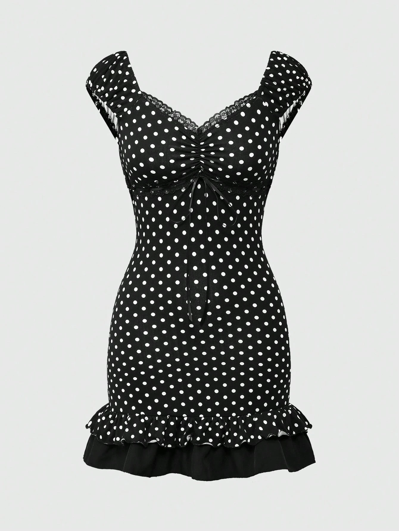 Kawaii فستان قصير نسائي ذو رقبة على شكل حرف V، مزين بقوس وبنقشة بولكا دوت ملونة بشكل متناسق