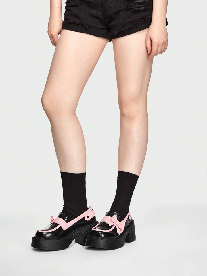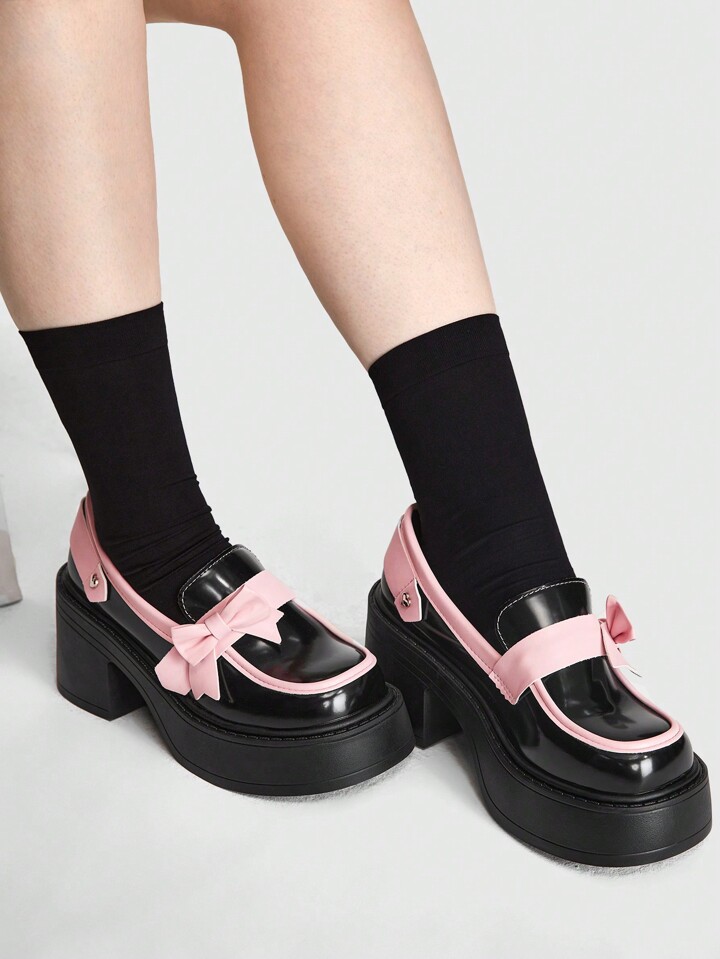 Kawaii نساء مزخرف بعقدة الفراشة شريط متباين منصة أحذية لوفر , بريبي خارجي حذاء
