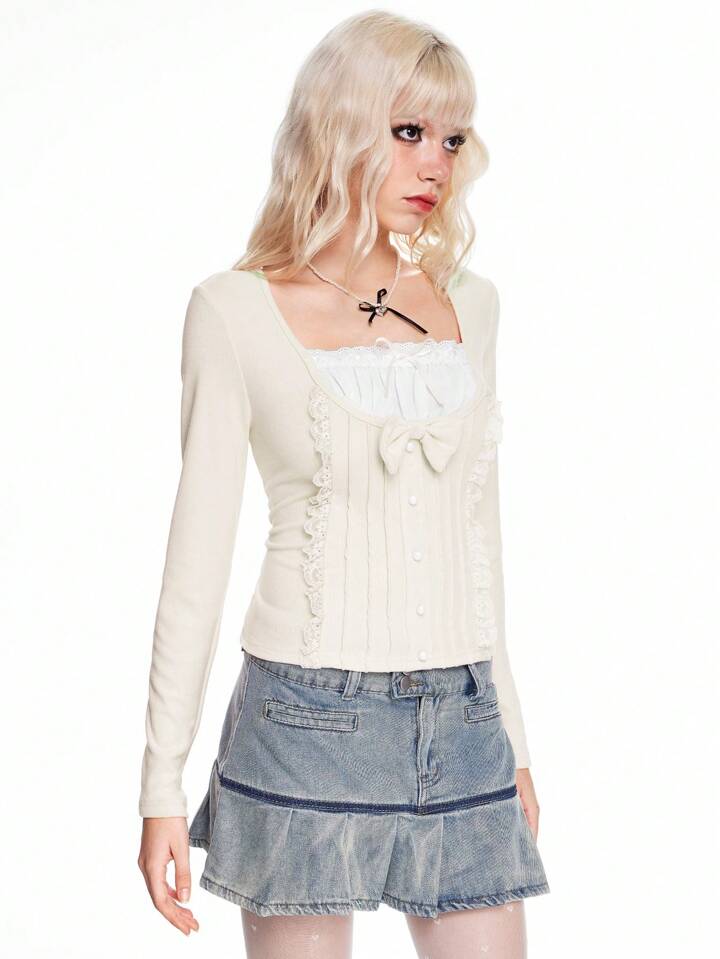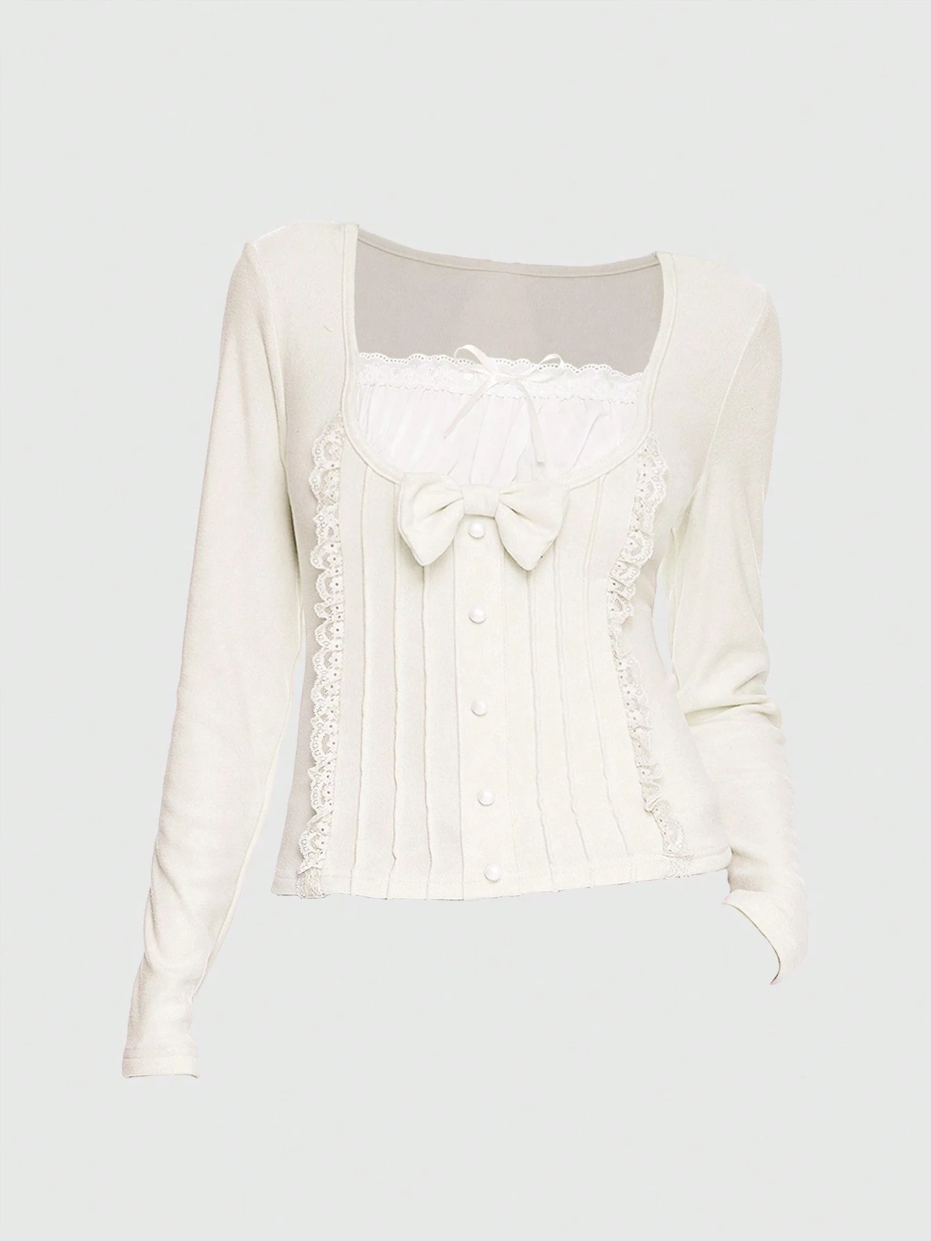 Kawaii تيشيرت نسائي بأكمام طويلة مزين بفيونكة ذو استخدامين