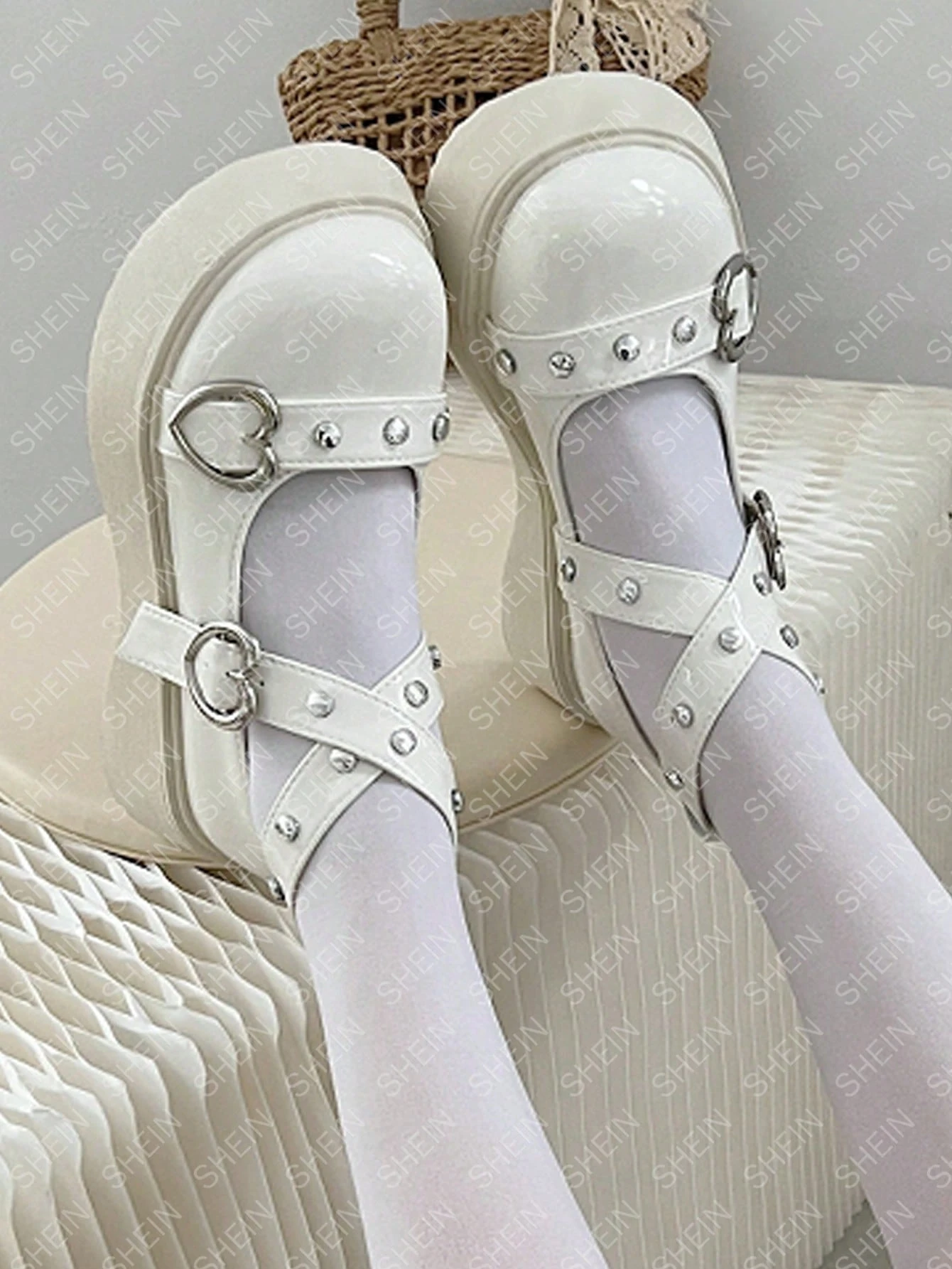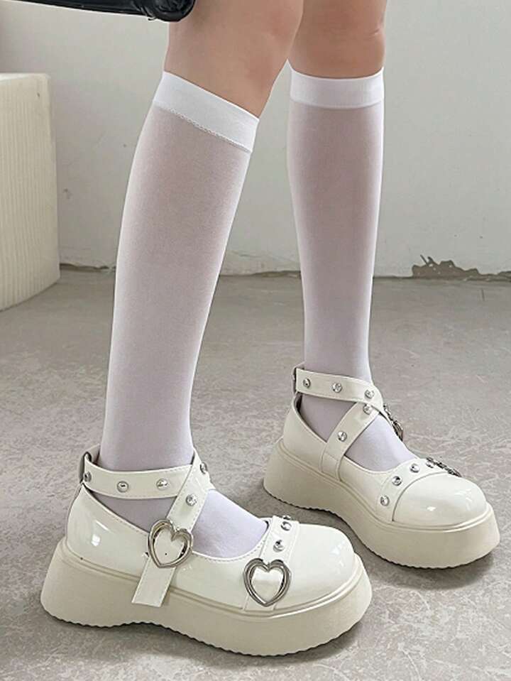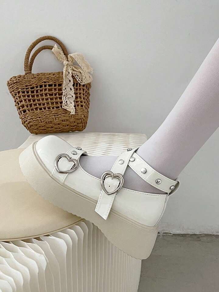 Kawaii حذاء ماري جين بمشبك قلب زخرفة باصابع قدم دائري نعل سميك ماري جين بريبي خارجي نساء