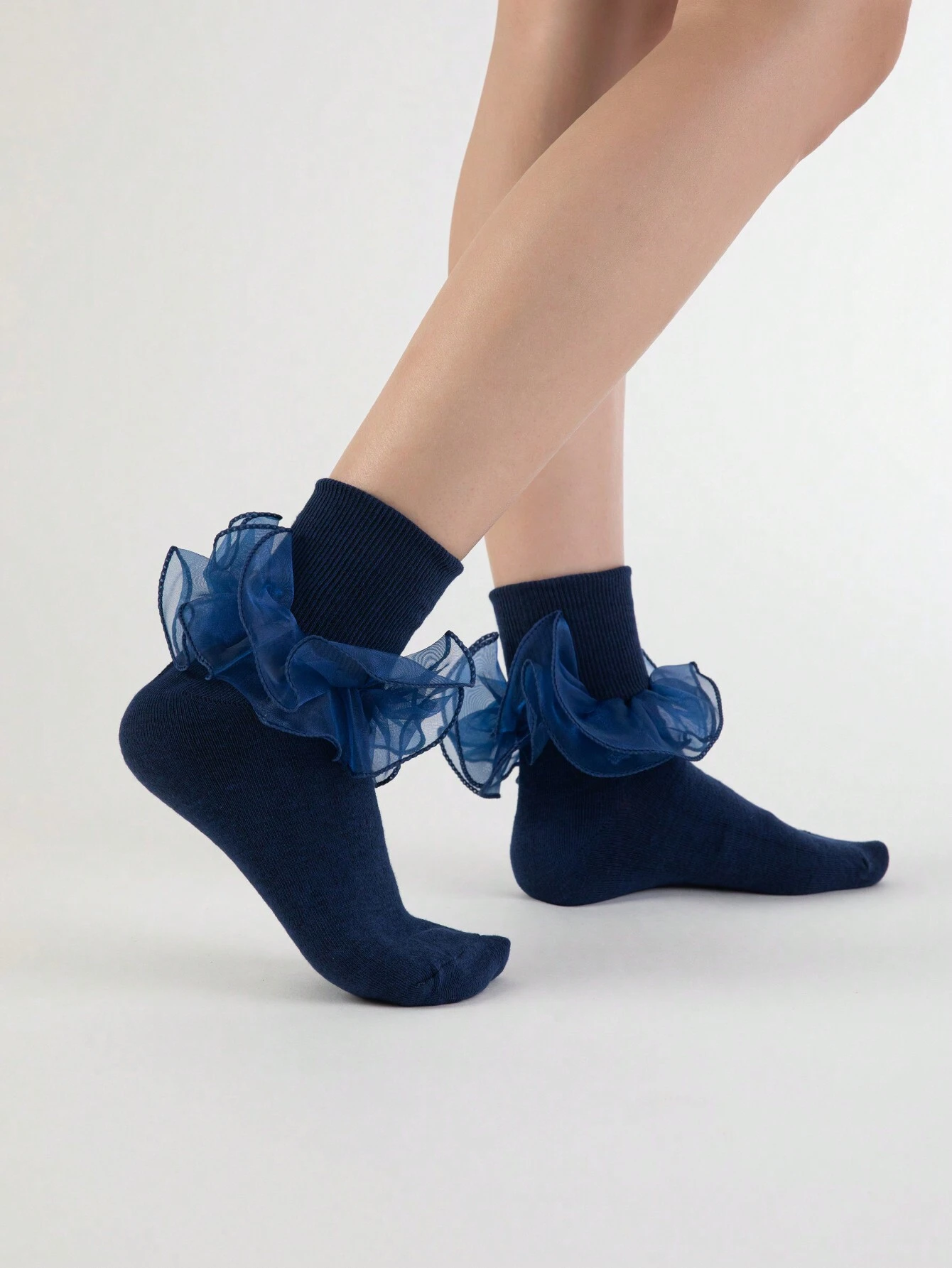 Kawaii جوارب طاقم بلون أحادي بتريمات دانتيل مكشكشة للنساء