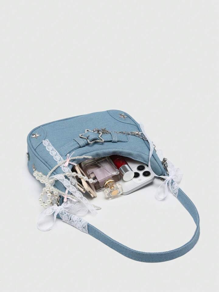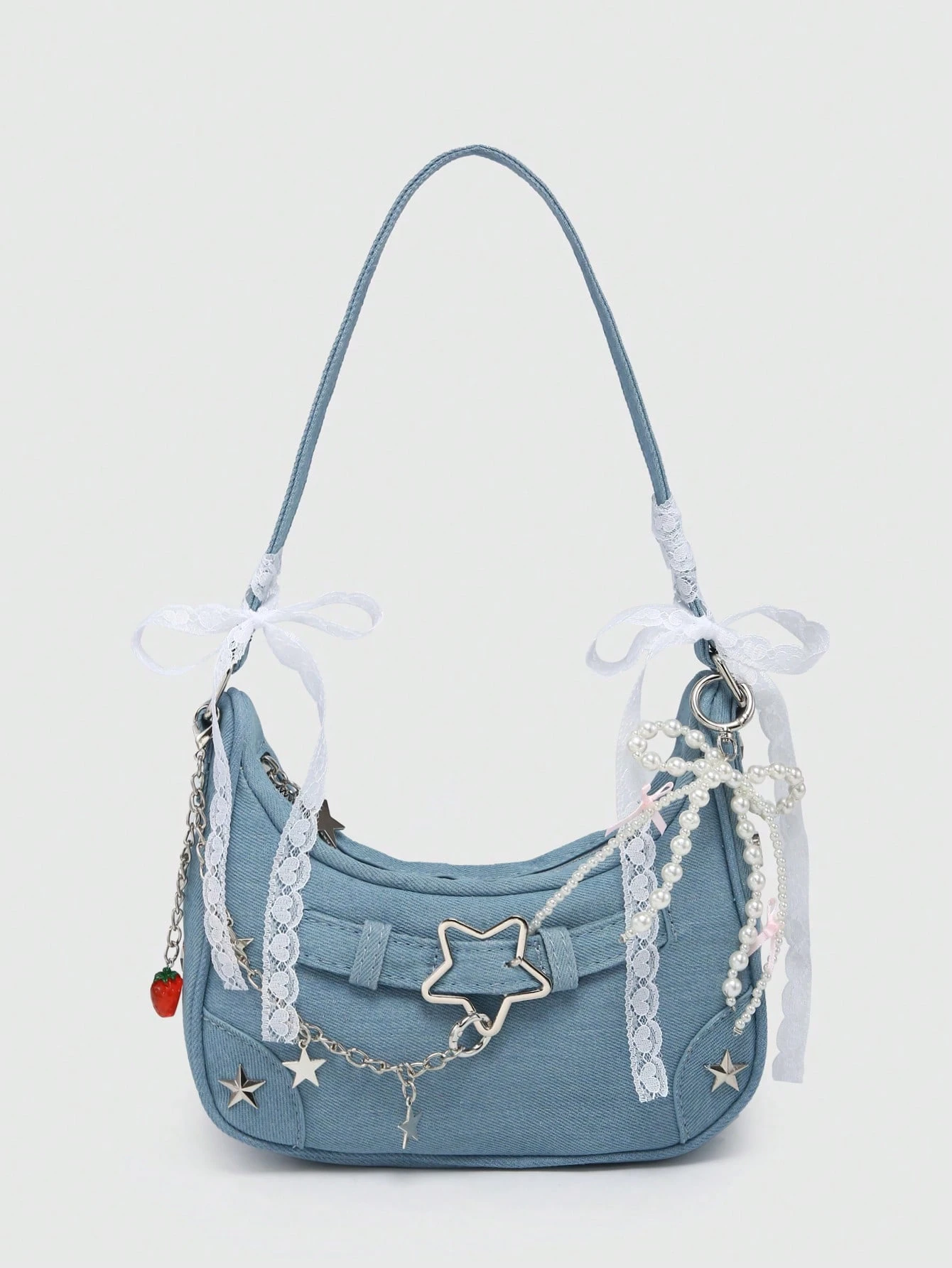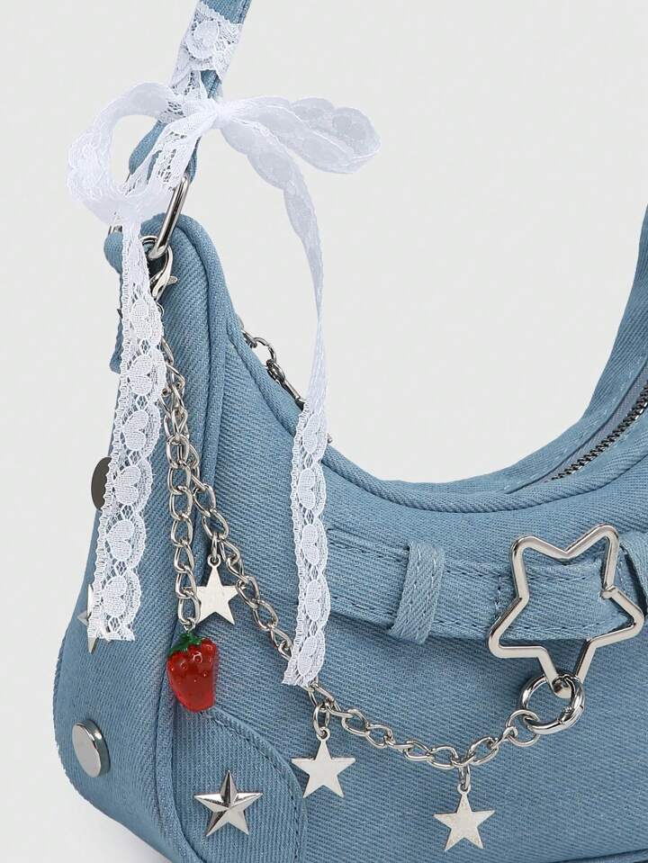 Kawaii حقيبة للكتف من المرأة على شكل هلال قمري معدنية مزينة بنجمة خماسية ذات طراز عتيق Y2K، زخرفة فيونكة و كرز