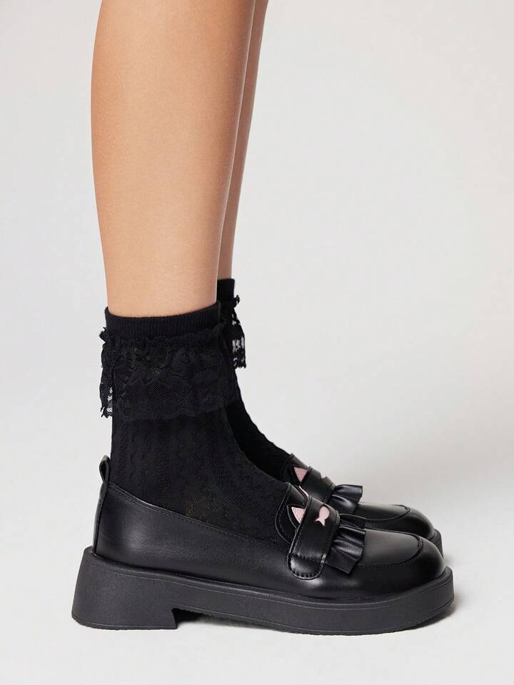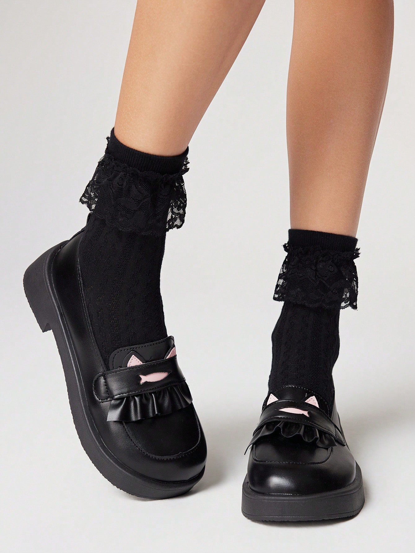 Kawaii كعب عالي أسود للنساء أحذية ماري جينز المغلقة, أحذية لوافر منسدلة بشرابات, أحذية وجاج لوليتا وردية بتصميم القطة على منصة