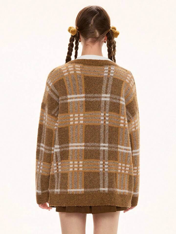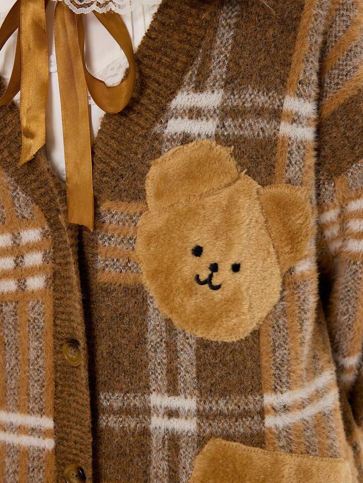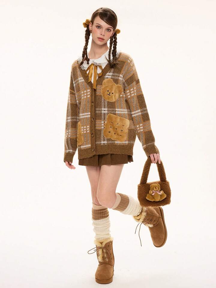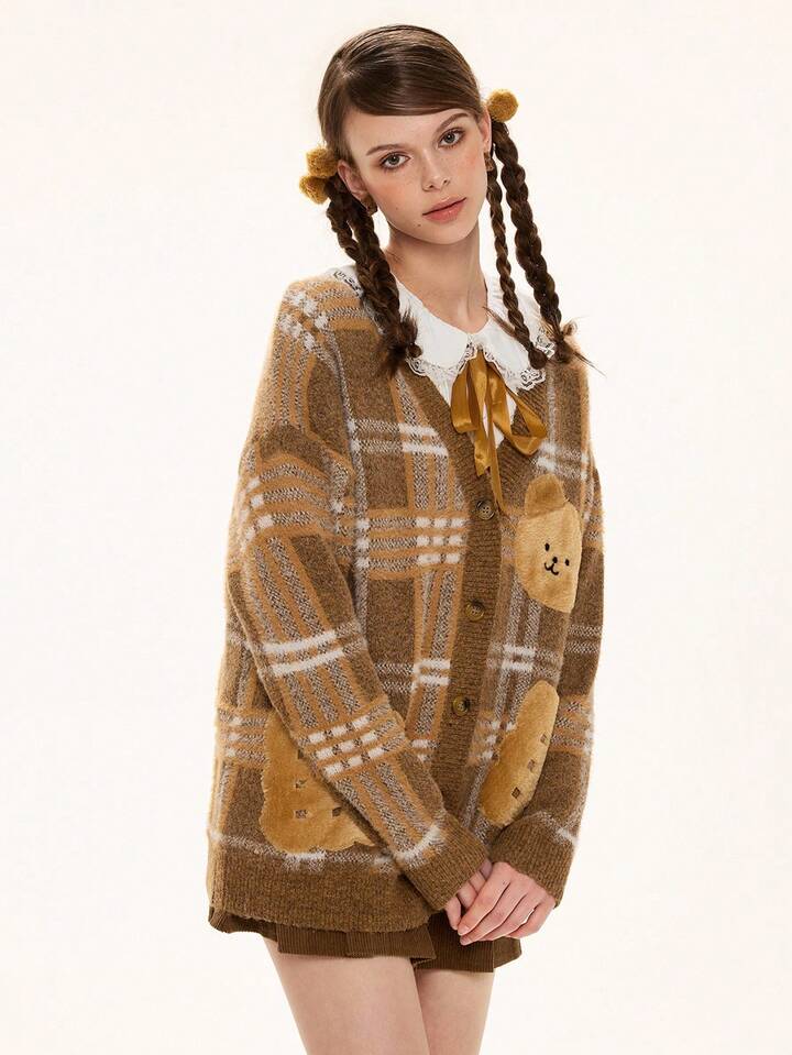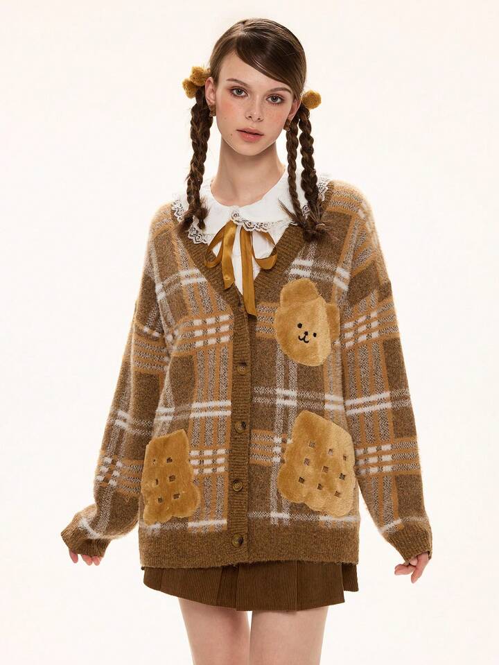 Kawaii كارديجان نسائي كاجوال للتنقل بياقة على شكل حرف V فضفاض مع رسومات كرتونية لدب وبسكويت جميلة، بنمط رقعة، للخريف/الشتاء