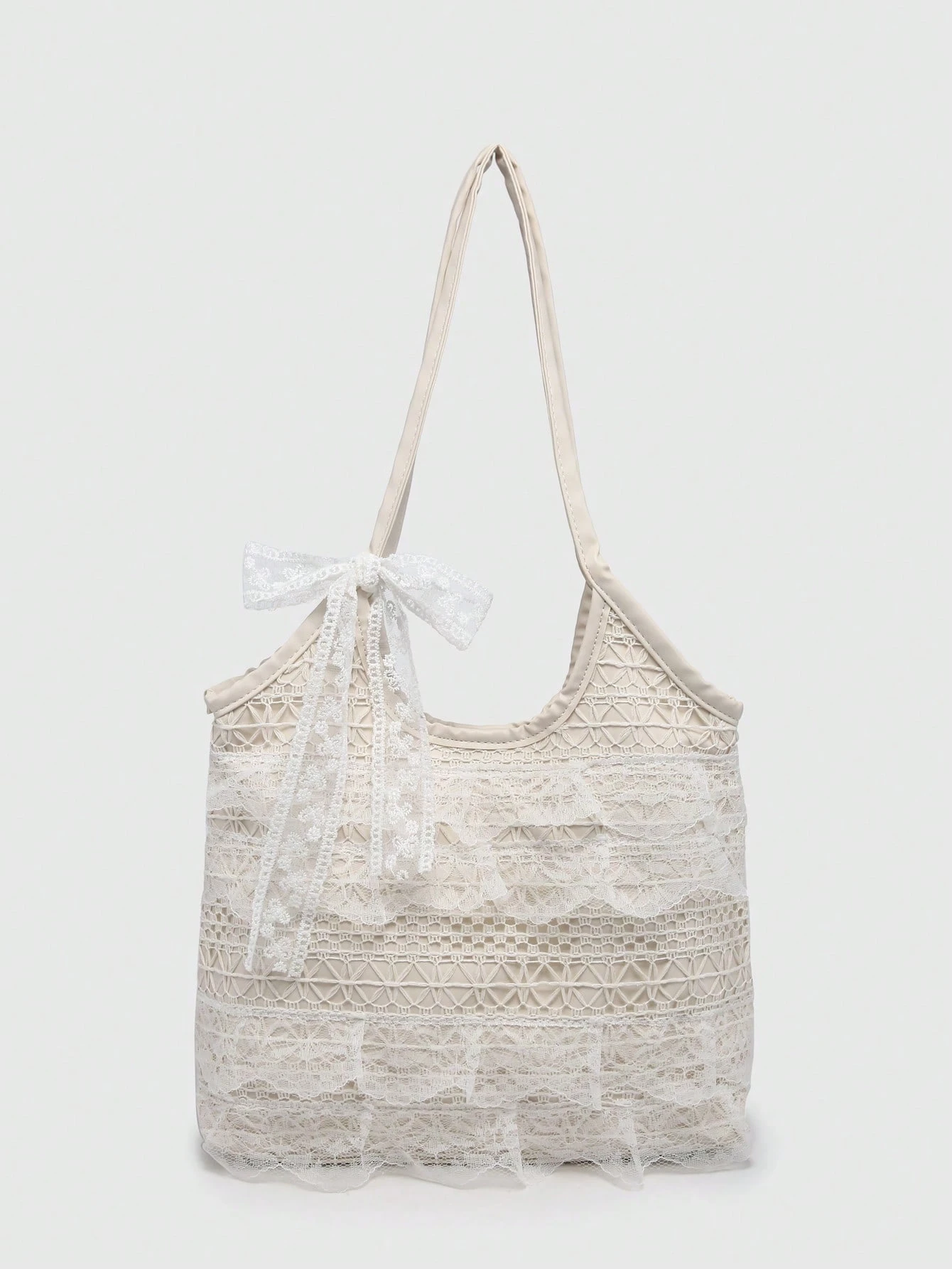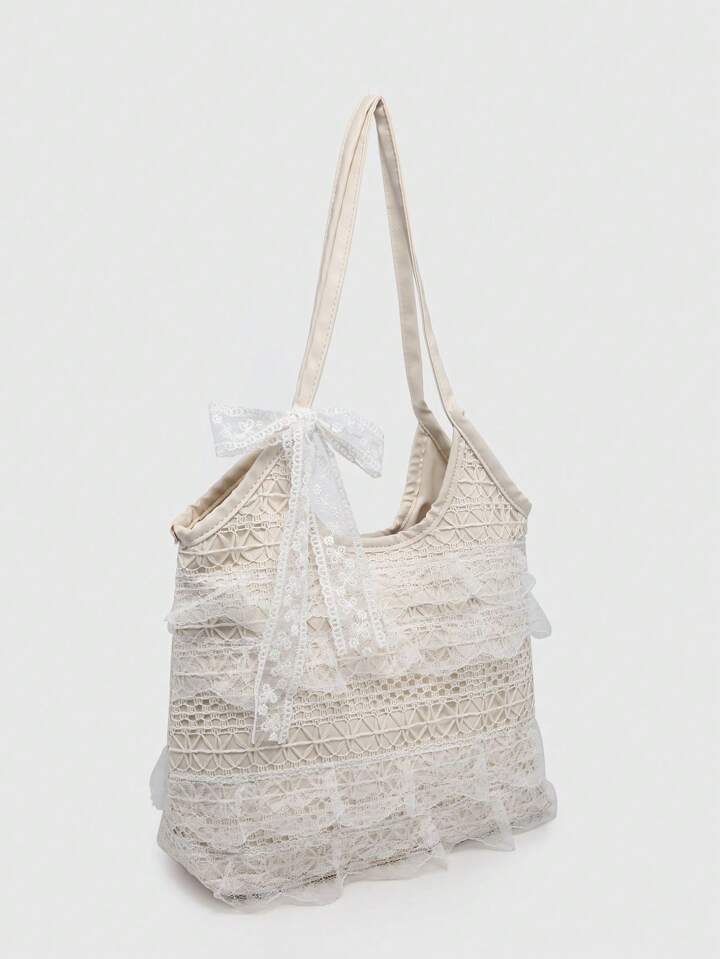 Kawaii حقيبة كتف نسائية مزينة بشريط أربطة الدانتيل والزهور الصغيرة الجميلة