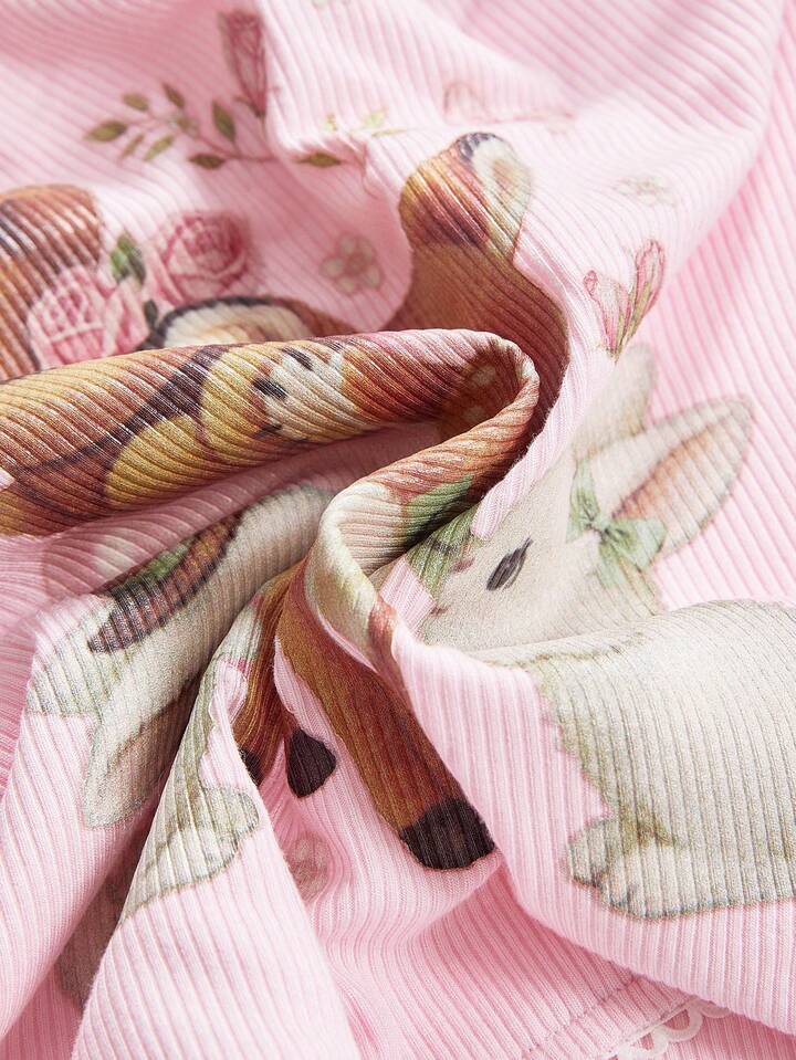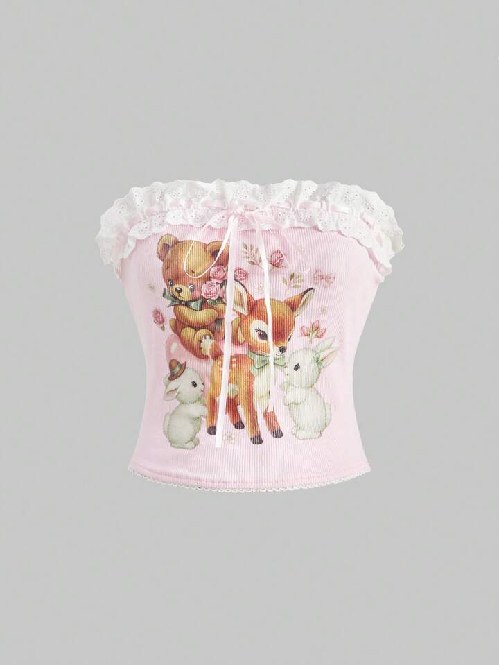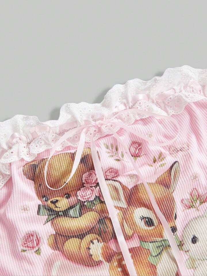 Kawaii ملابس علوية نسائية كيوت بطبعات دببة عتيقة، جواد، أرنب مع تطريز دانتيل وفيونكة