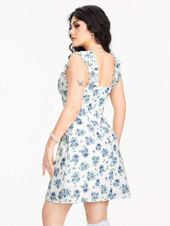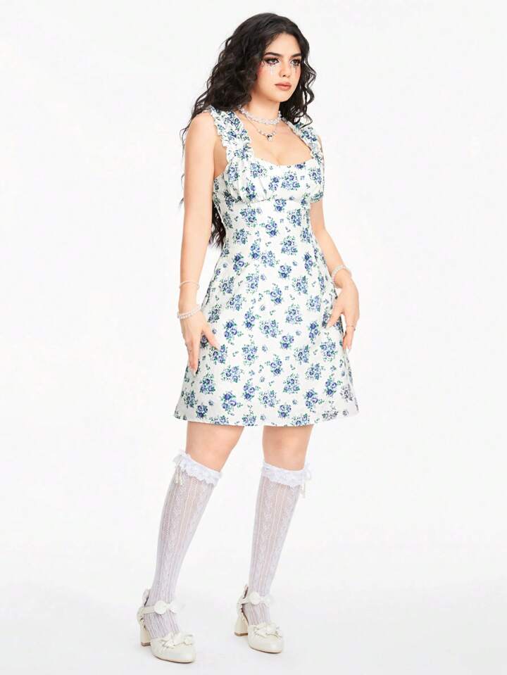 Kawaii فستان صيفي بدون أكمام وحمالة كتف سميكة مطبوع عليه زهور مجمعة عند الصدر للنساء