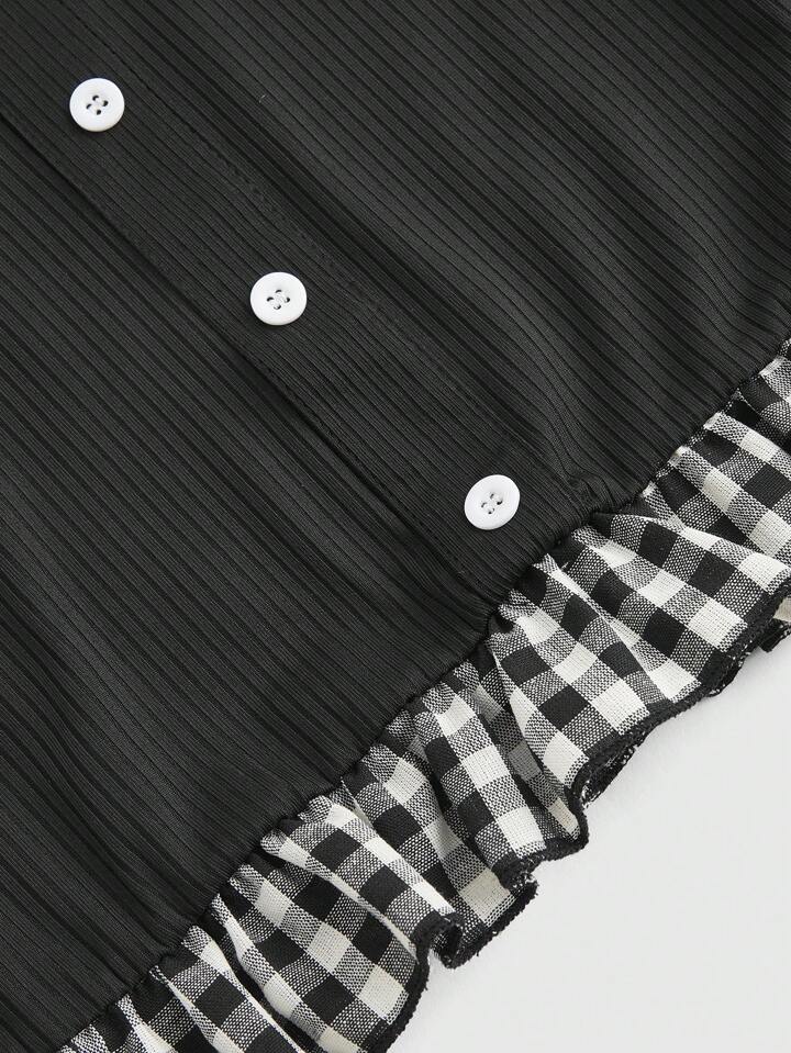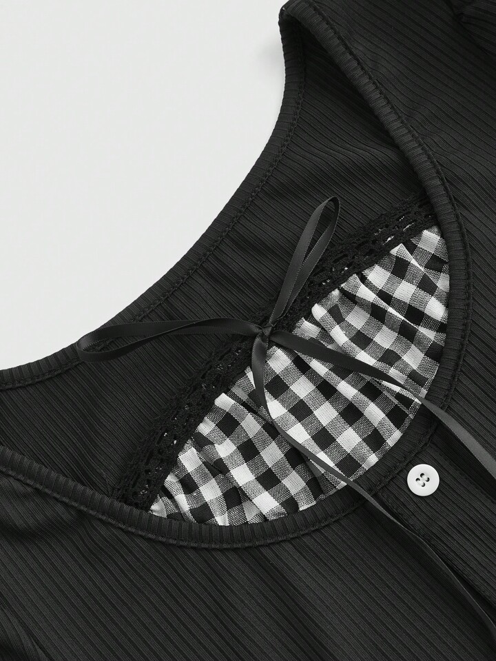 Kawaii تي شيرت T نسائي بياقة مربعة وأكمام منفوخة، لونين قماش مربع المدرسة