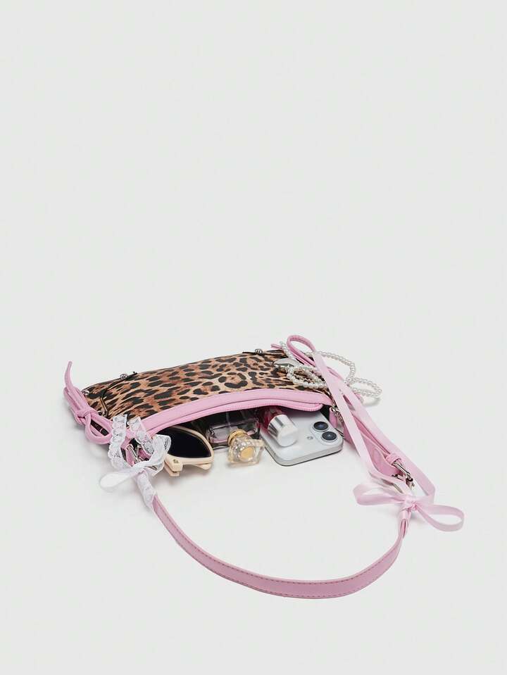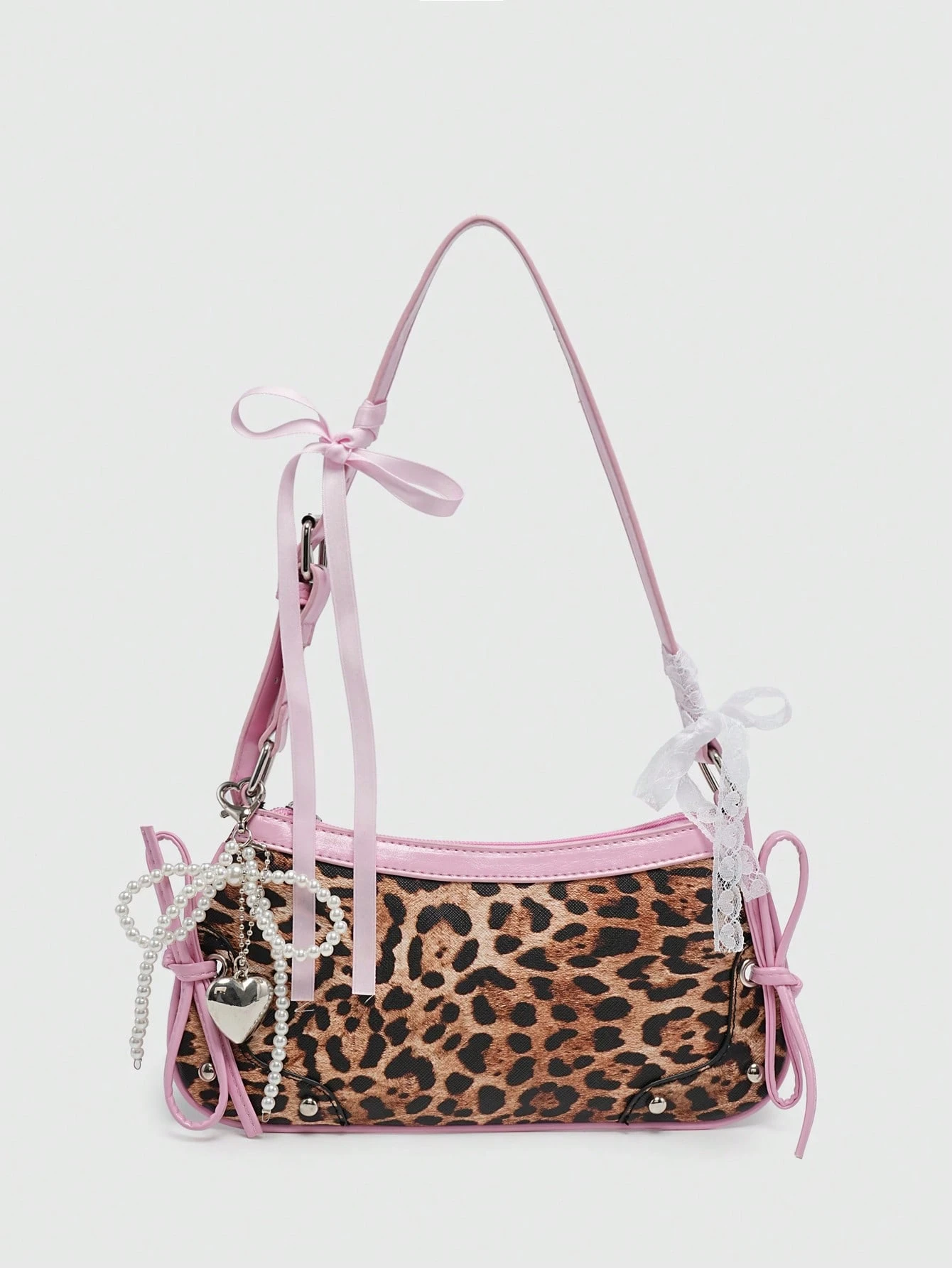 Kawaii حقيبة كتف/إبط بنمط الفراشة الرجعي مزينة بسلسلة، طباعة جلد النمر، زخرفة من اللؤلؤ الاصطناعي والدانتيل، حقيبة نسائية، حقيبة نمر جديدة للخريف والشتاء للنساء