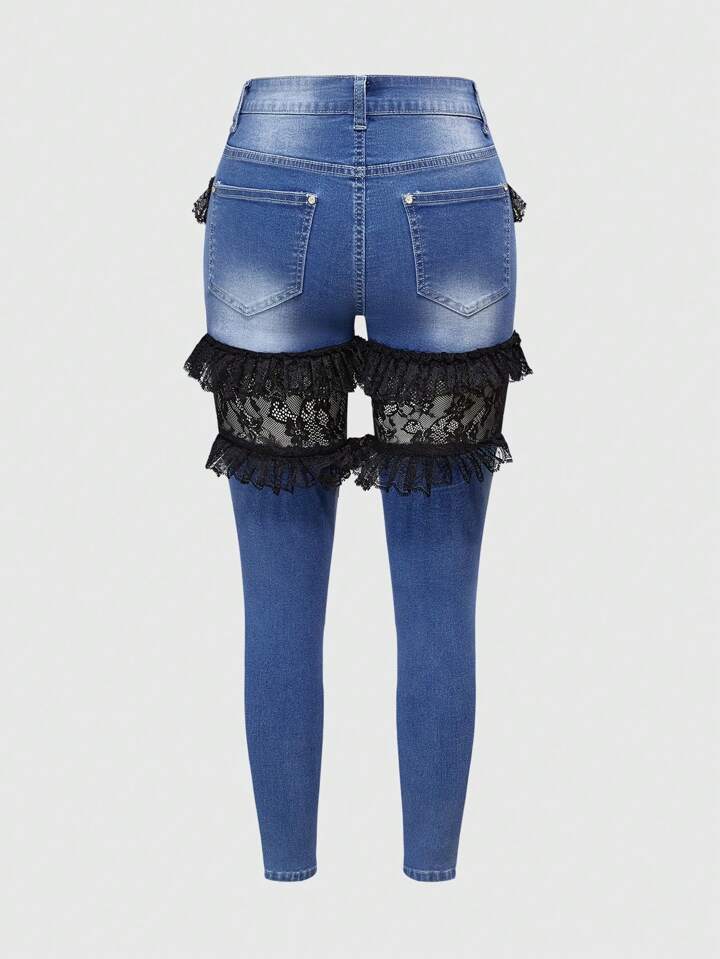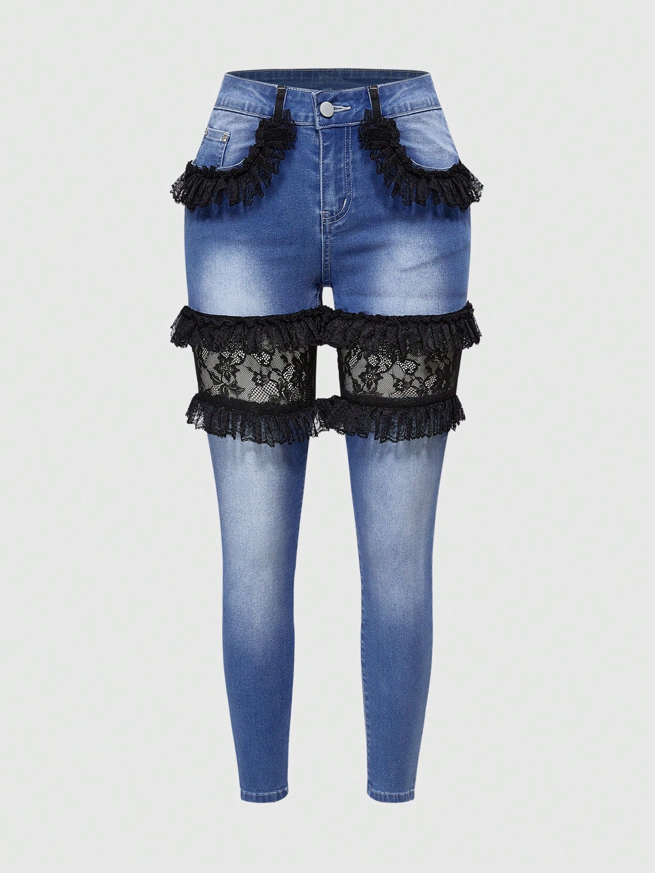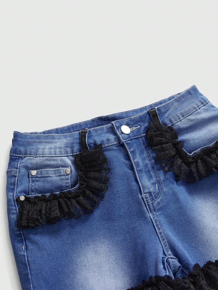 Kawaii جينز جيرلي طويل من الأرجل بفتحات واسعة، مع تريم شريط الدانتيل والفيونكة بطراز Y2K المثير للنساء
