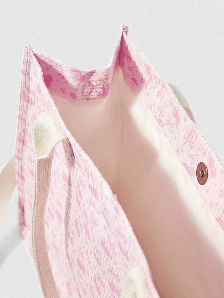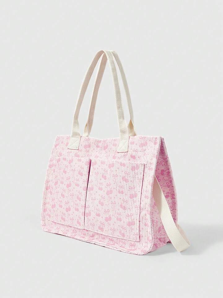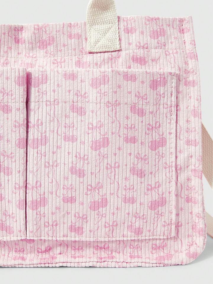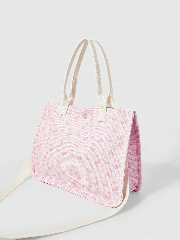 Kawaii حقيبة كورديروي بيضاء فضفاضة للنساء - حقيبة يد قابلة للتحويل بطبعة الفيونكة والكرز للاستخدام عبر الجسم/الكتف