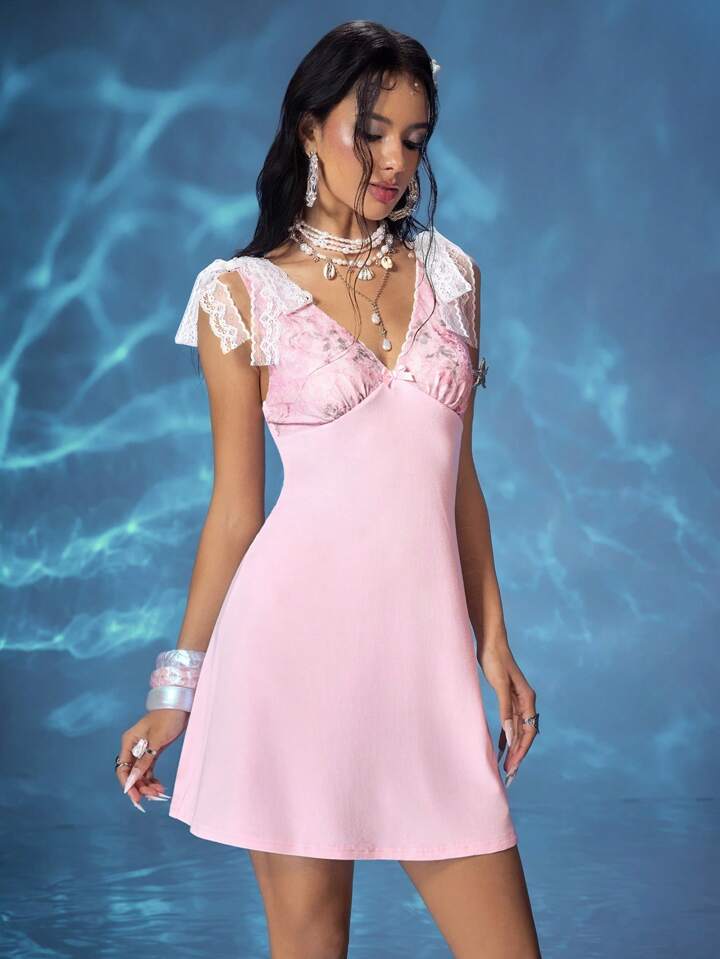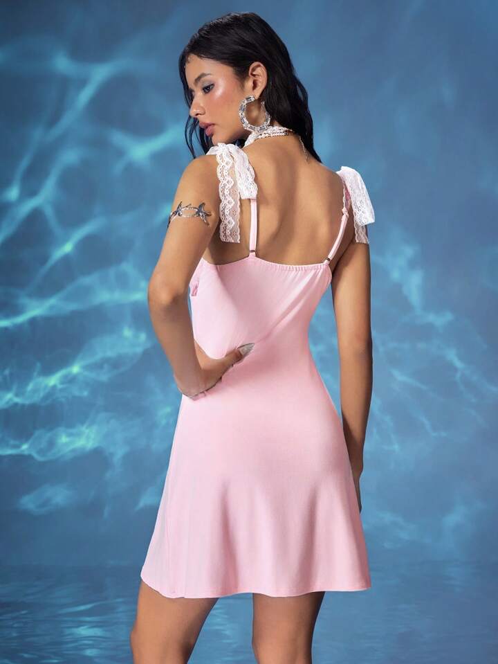 Kawaii فستان صيفي أنيق قصير مرقَّع بالدانتيل للنساء