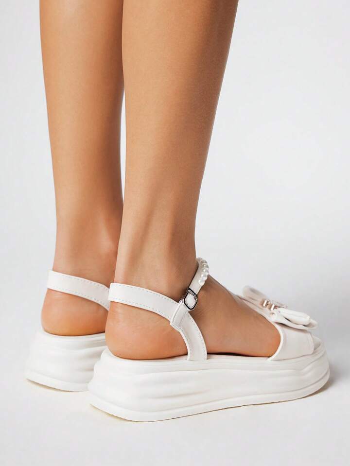 Kawaii نعال صنادل منصة بكعب مدور وفيونكة مزينة، طراز مدرسي كاجوال، أحذية للخارج والشاطئ صيفي