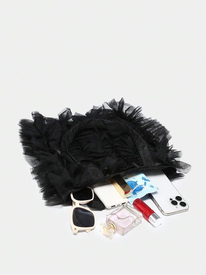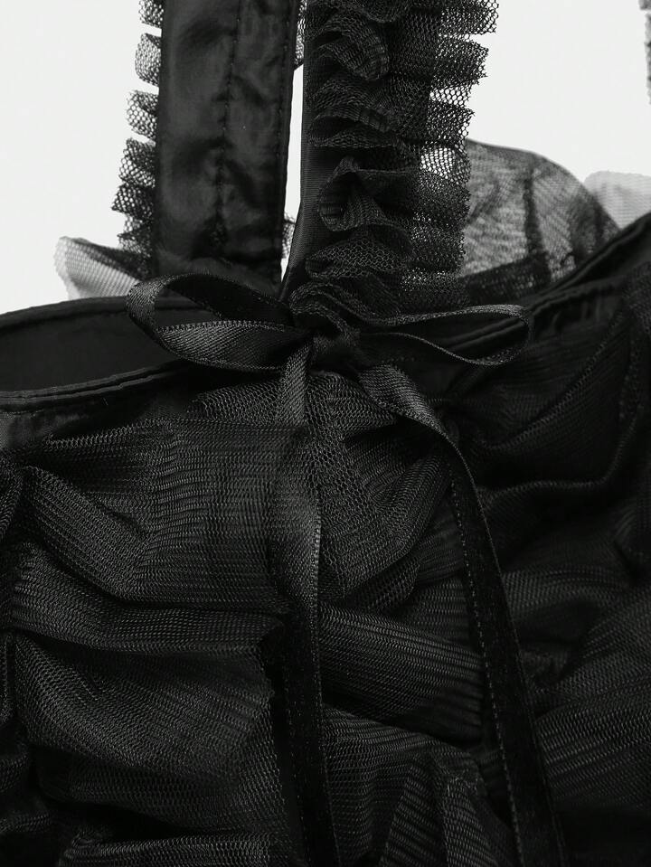 Kawaii حقيبة منسوجة سوداء بطراز عطلة نمط قديم للنساء مع شريط كشكش وعقدة فراشة، سعة كبيرة