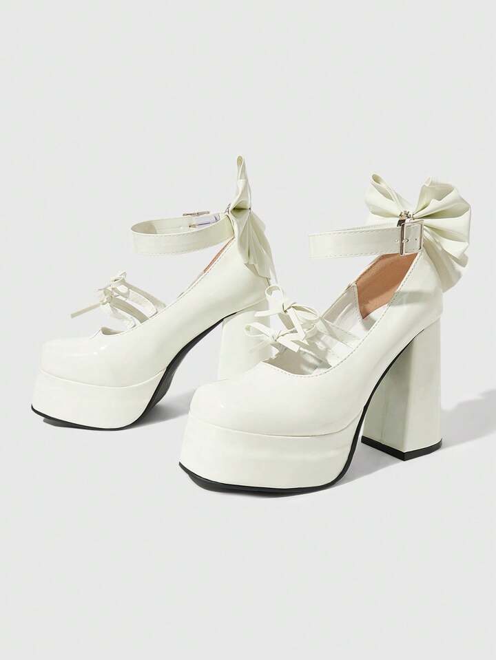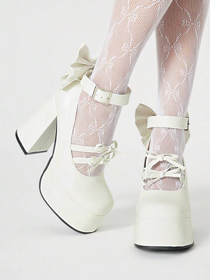Kawaii أحذية نسائية بكعب عالي مغلقة الأصبع بكعب سميك من الجلد الأبيض، مع رباط، وفيونكة، وأربطة، وكعب منصة، من طراز يونيفورم المدرسة اليابانية