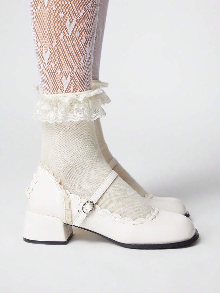 Kawaii أحذية كعب عالي أبيض للنساء بنسيج الدانتيل ذات إصبع مغلق من نوع "ماري جين"، مناسبة للعمل والزي الرسمي والمناسبات الرسمية
