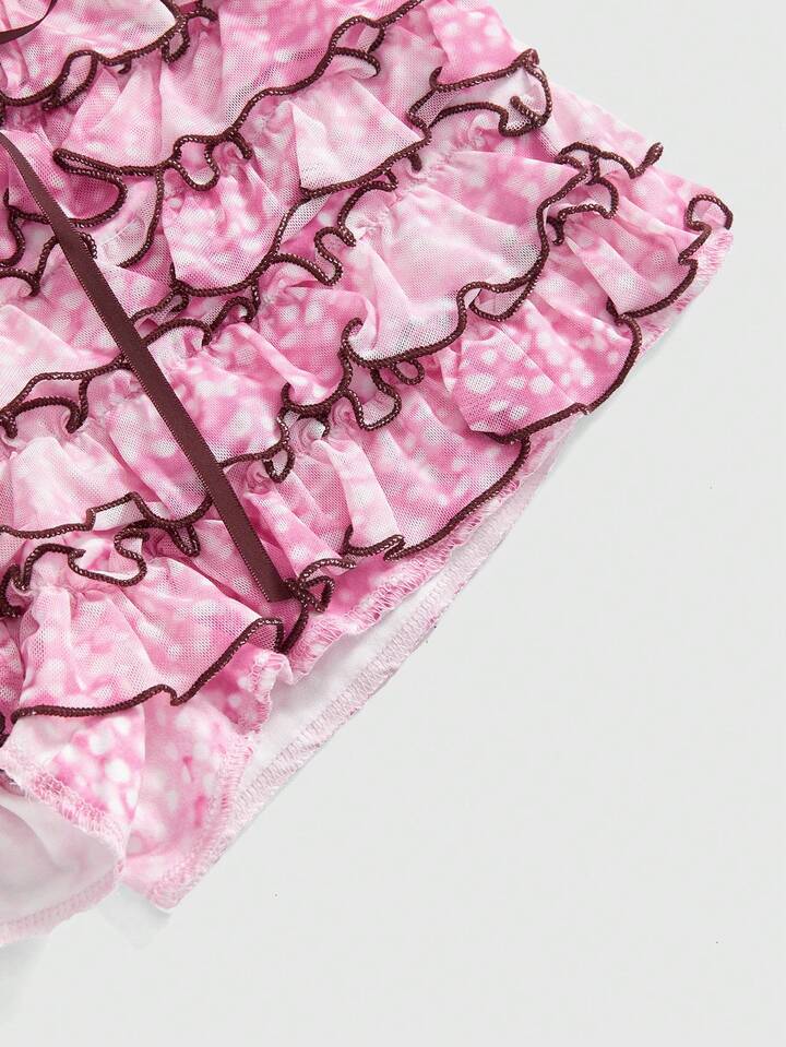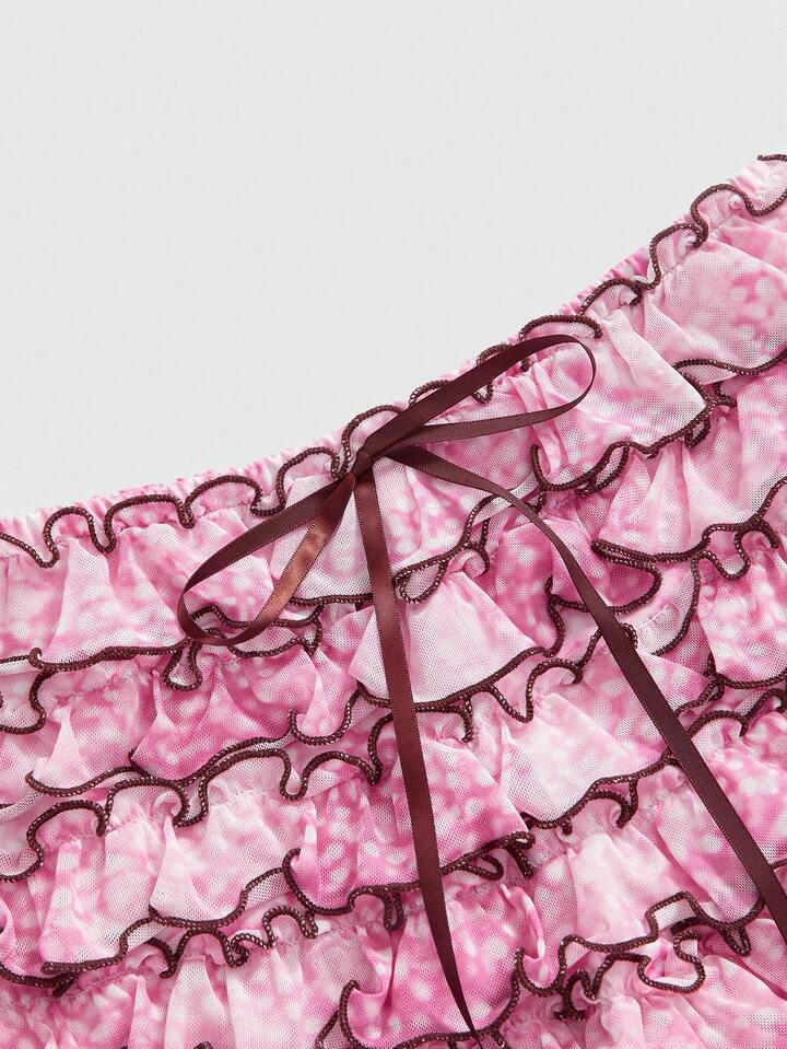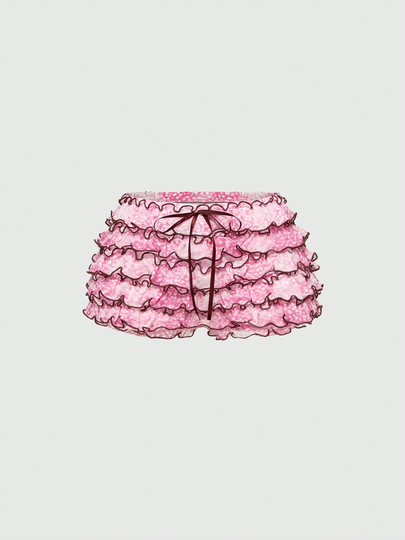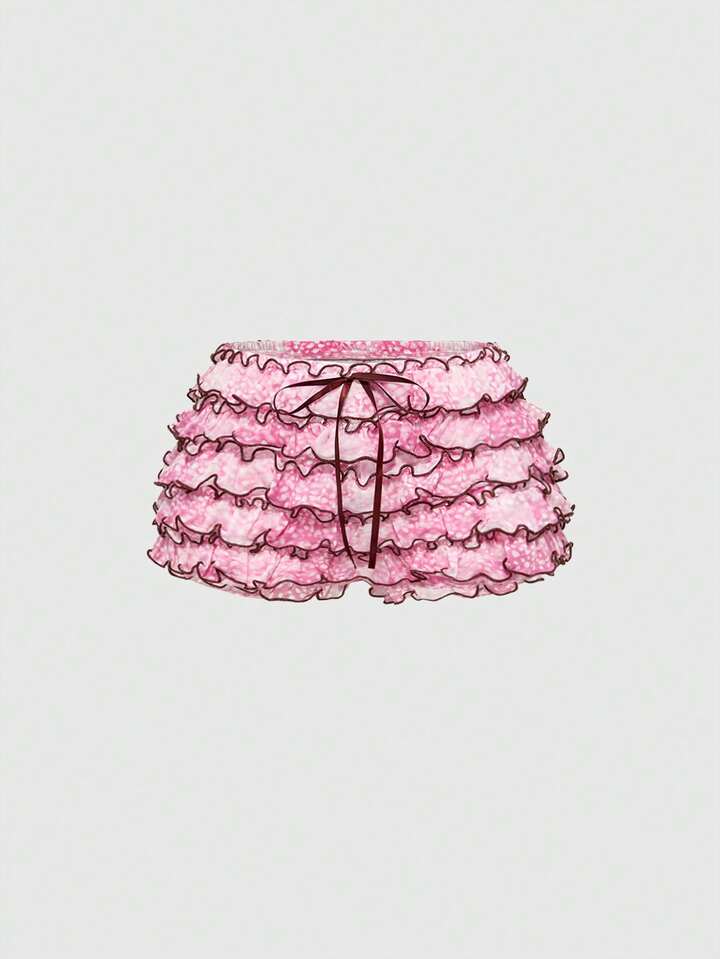 Kawaii شورت نسائي ذو خصر منخفض مطبوع بطبعة الغزال، مزين بكشكشة من الشبك على الحافة