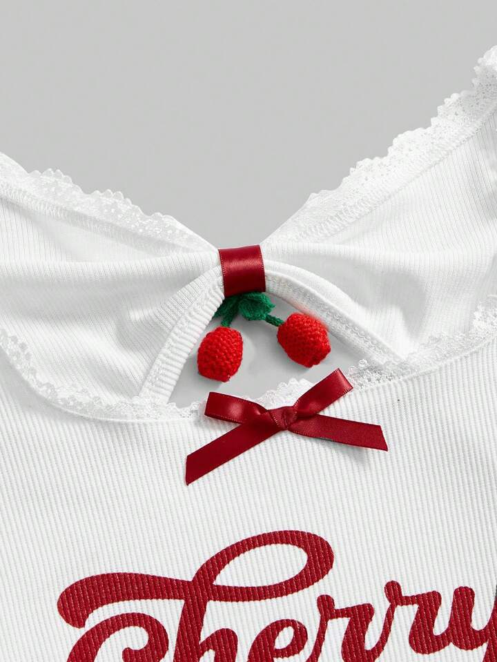 Kawaii تي شيرت ضيق بتفاصيل ربطة القوس ودون ظهر بطباعة شعار الكرز بطراز Y2K