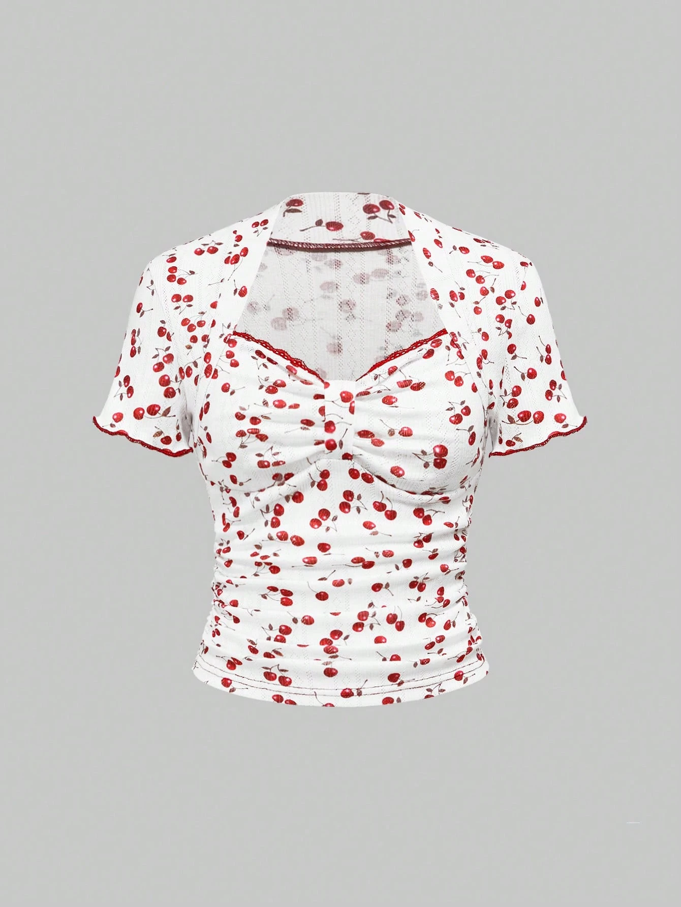 Kawaii ملابس علوية نسائي ضيق قصير مزخرف بطباعة الكرز بأسلوب Y2K مع خصر منتفخ