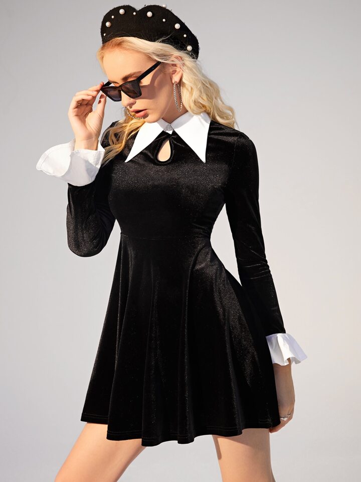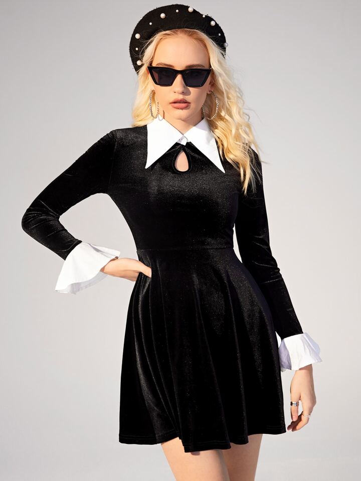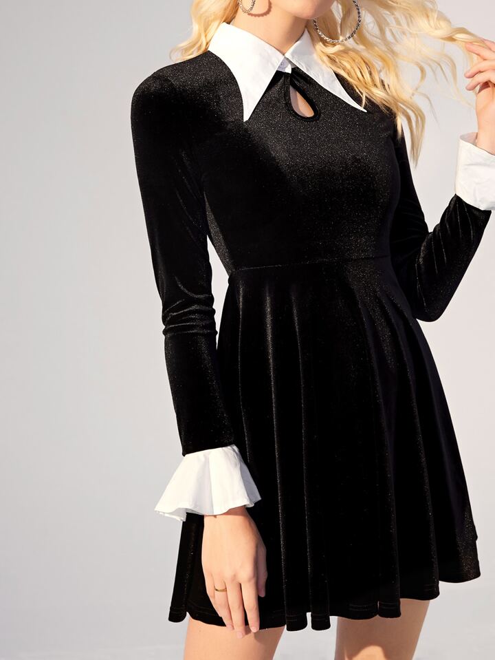 فستان مخملي باكمام مكشكش بياقة متباين بفتحة