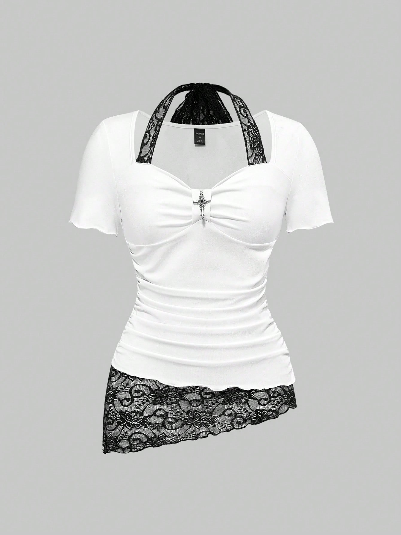 تي شيرت نسائي بحاشية غير متماثلة من البتلات المحبوكة وربطة الرقبة والخصر