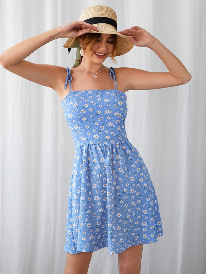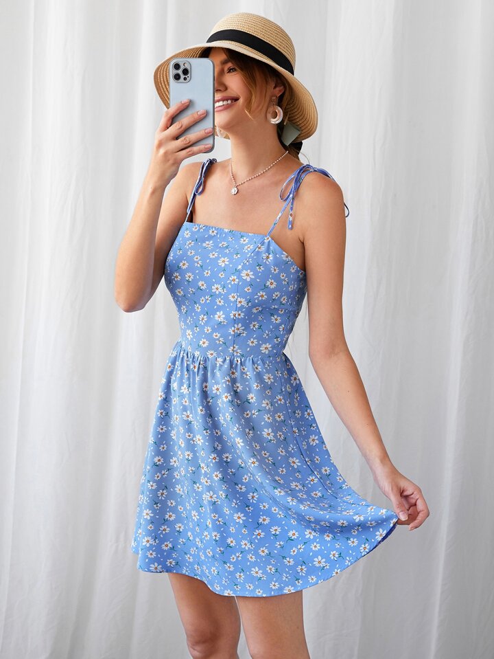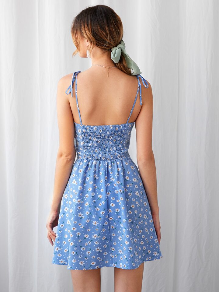 فستان كامي مزهر مدرز خلفي بحزام معقود