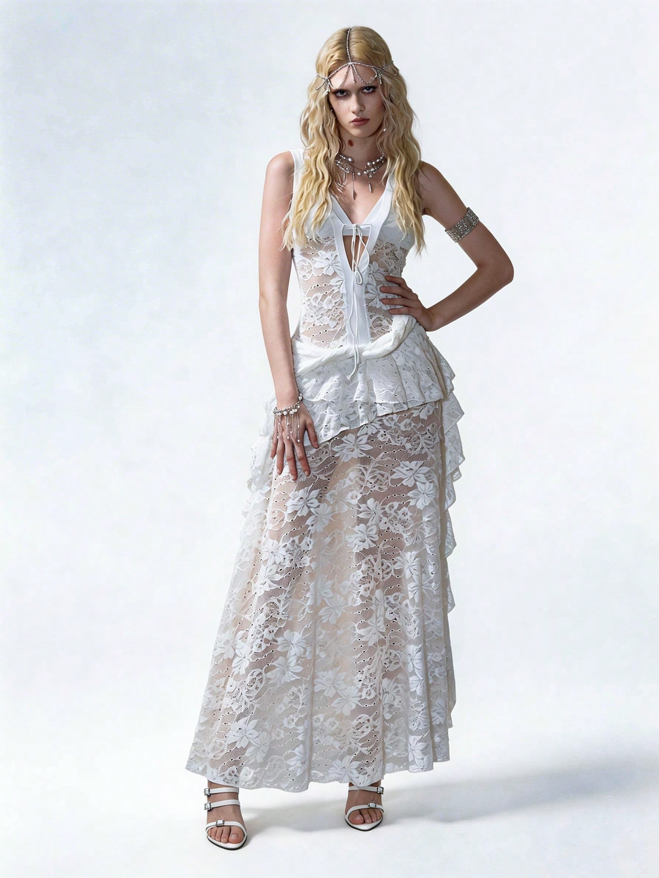 فستان شفاف بياقة V عميقة مزين بالكشكشة والدانتيل، مناسب لمهرجانات الموسيقى الغربية