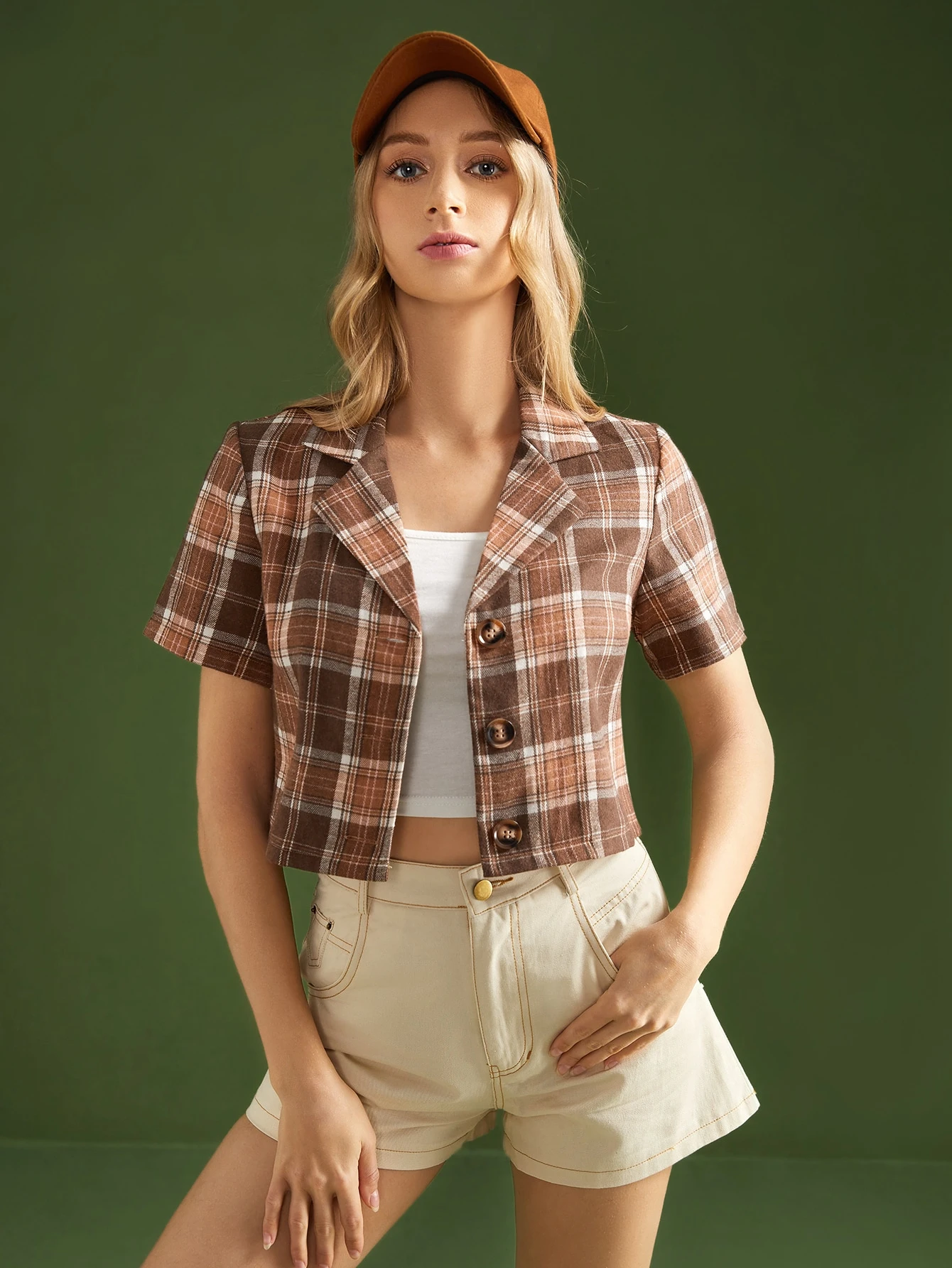 بلوزة قصيرة ياقة مطوي مسنن مربعات ملونة