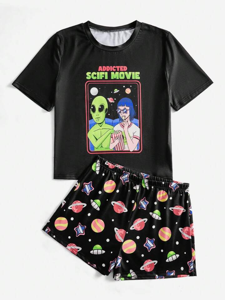 Lasthopeparty طقم بيجامة تي شيرت وشورت طباعة كائن فضائي