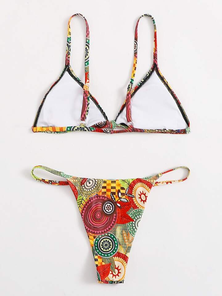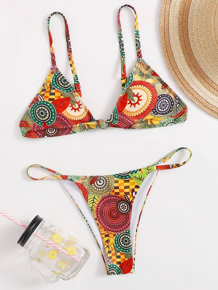 مجموعة بيكيني مثلث بطباعة أوراق و أشكال هندسية لصيف على الشاطئ