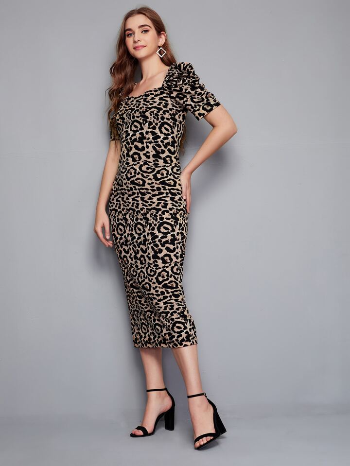 فستان بحافة فتحة وباكمام منتفخة بطباعة الفهد