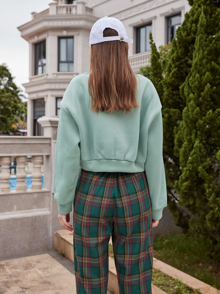 قميص ثقيل قصير منخفض الكتف مطرز بعبارة