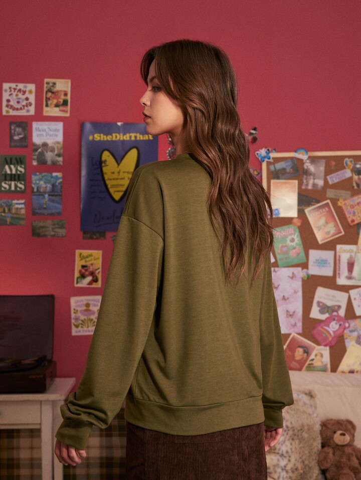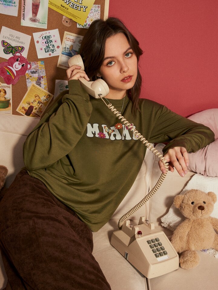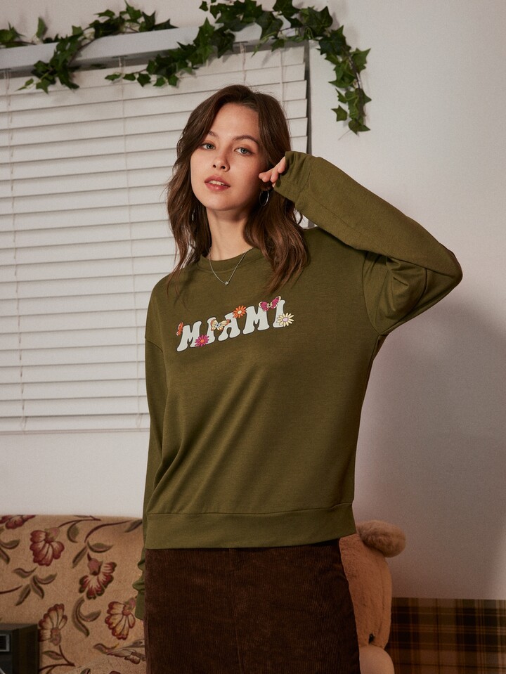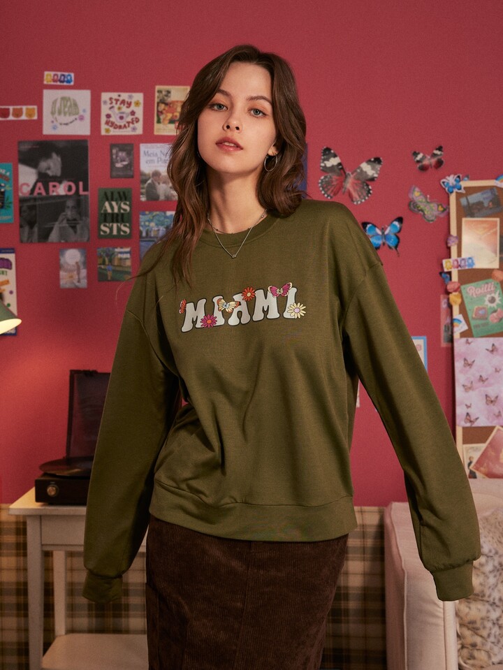 قميص ثقيل حرف بطباعة أزهار مع نمط الفراشة منخفض الاكتاف