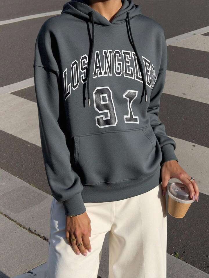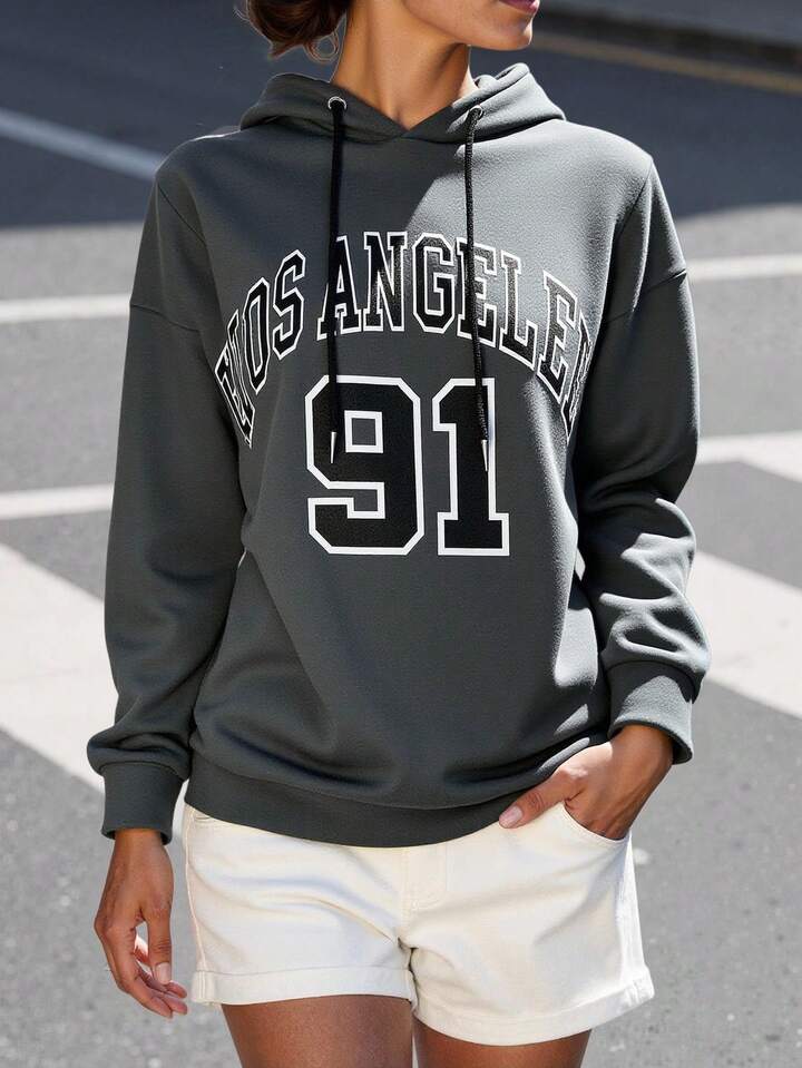 هودي بغطاء للرأس وسحاب وطبعات أحرف، أكمام طويلة