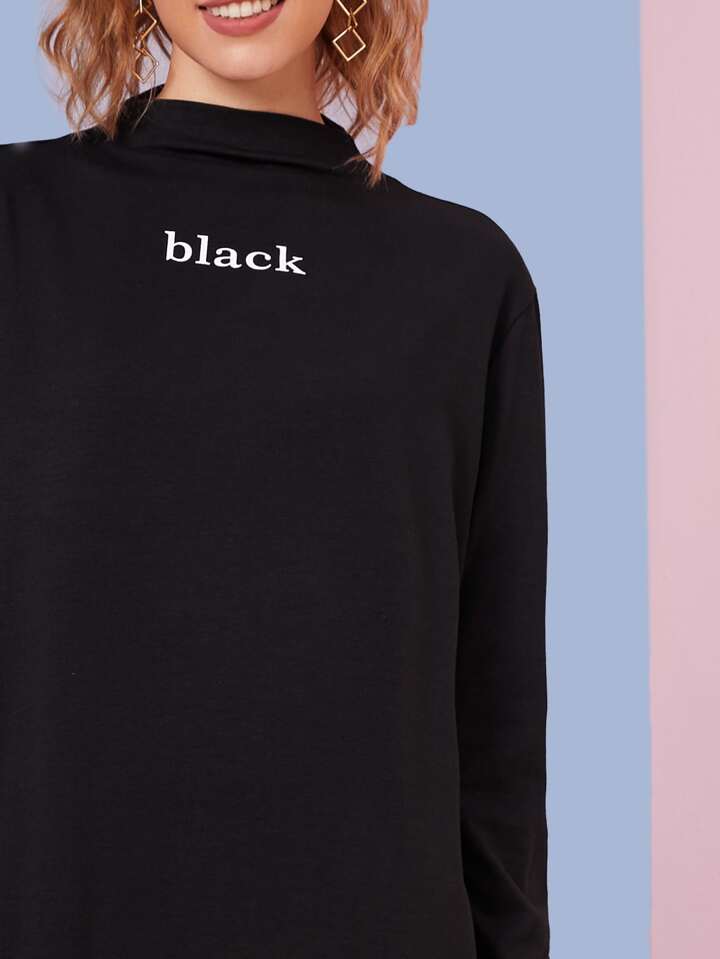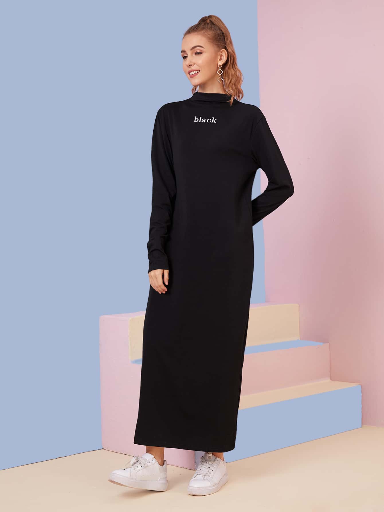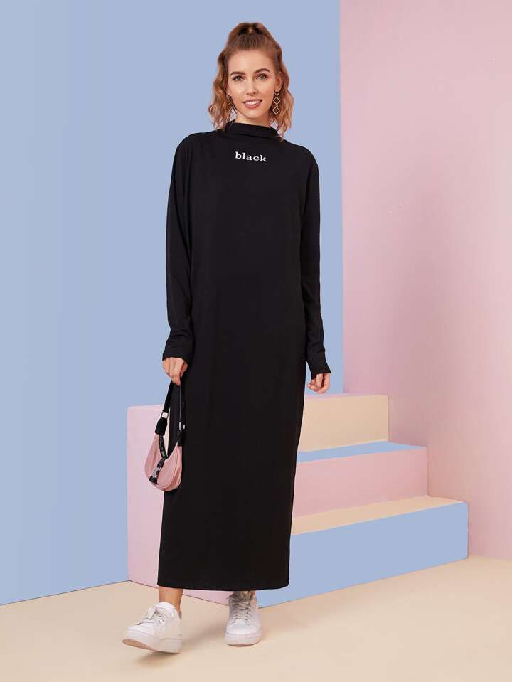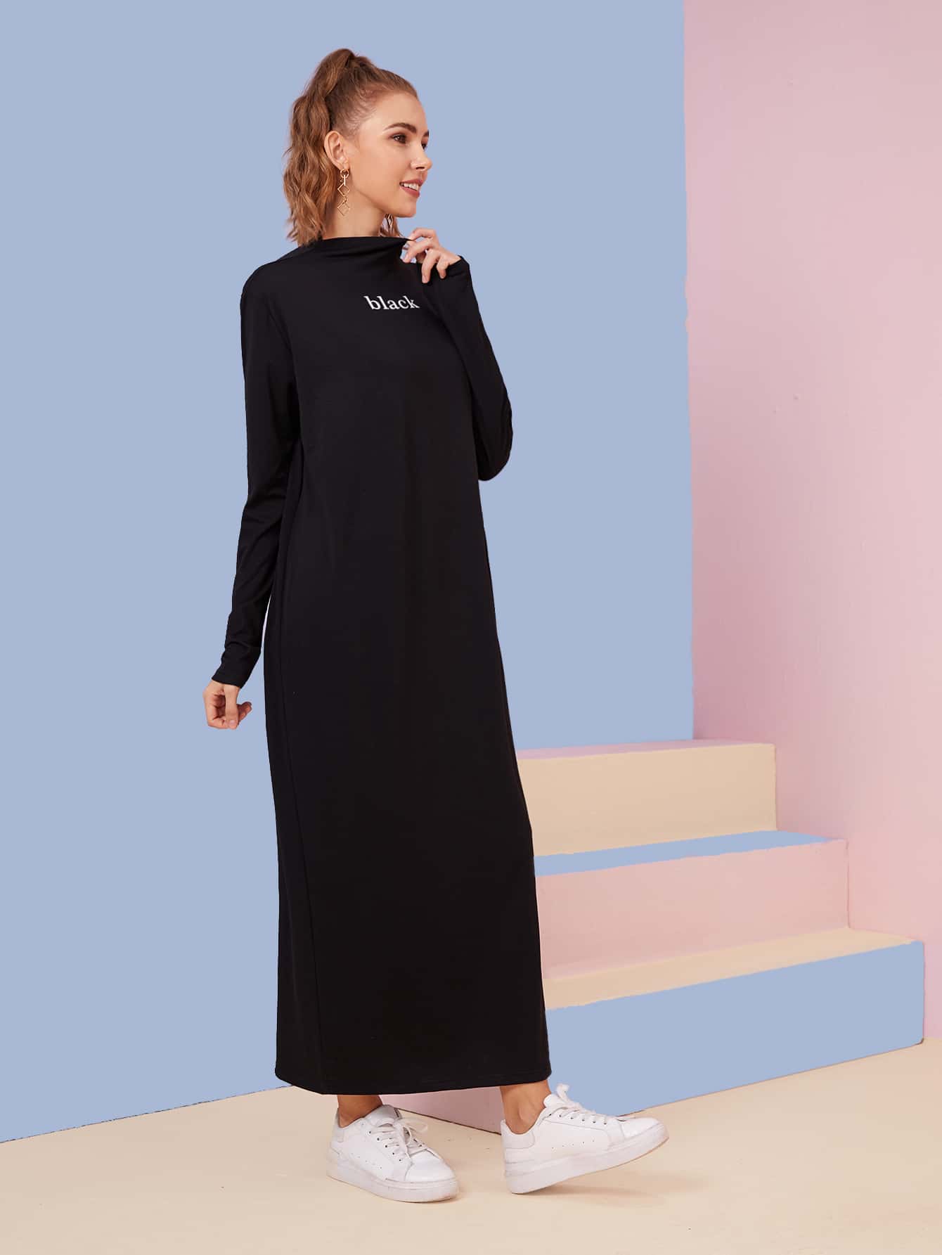 فستان تي شيرت بعقنق دائي وبجرافيك عبارة