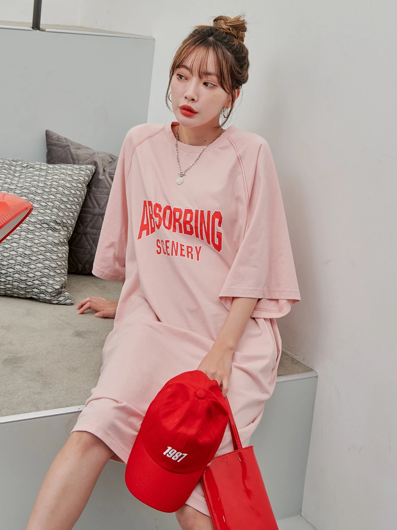 فستان تي شيرت باكمام راجلان بجرافيك عبارة