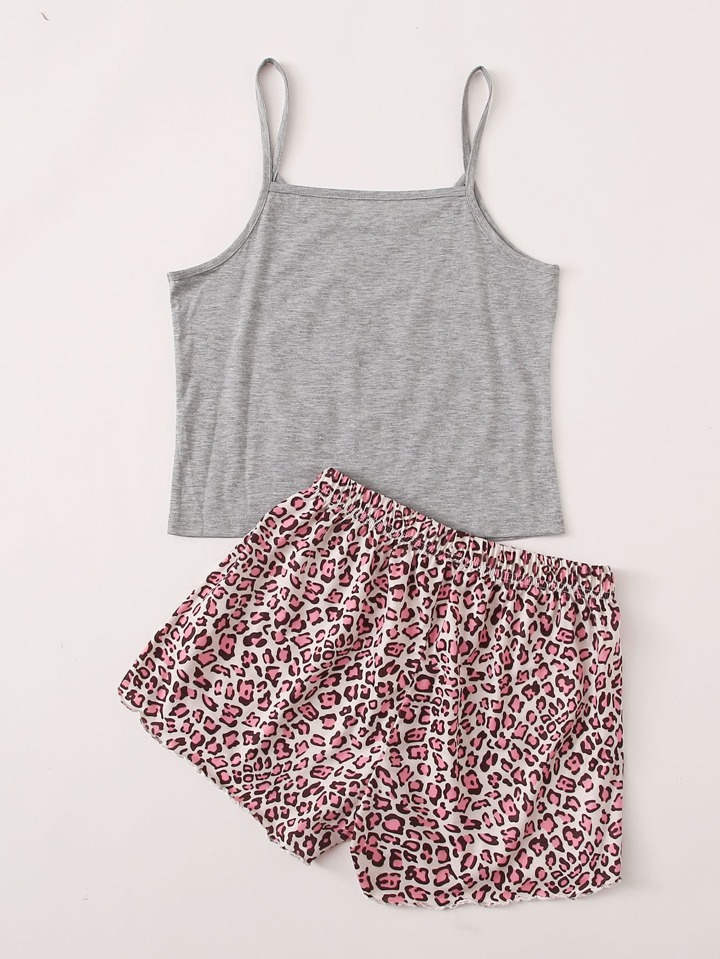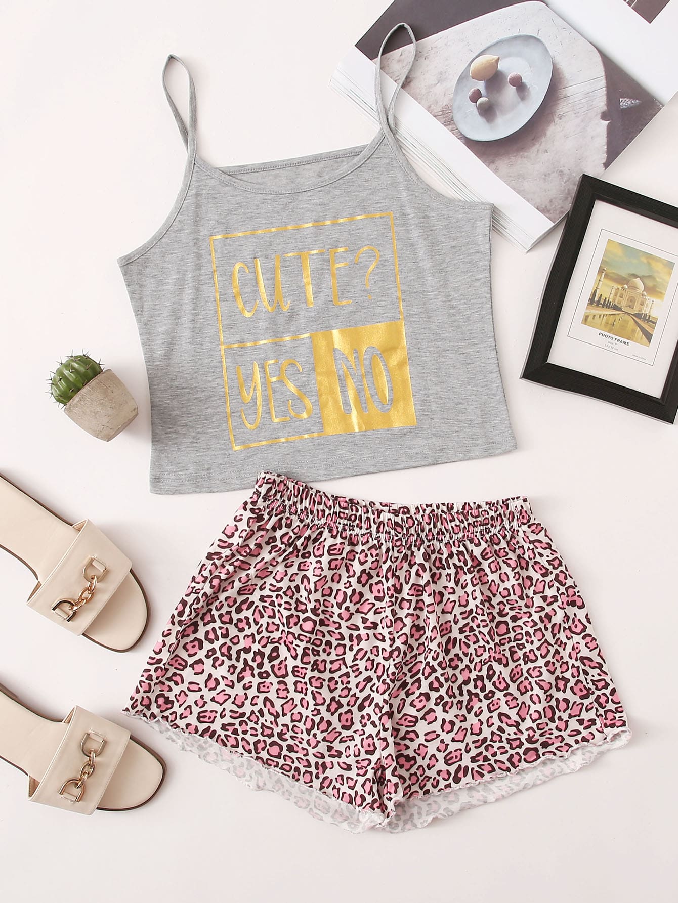 طقم بيجامة سروال قصير نمط جلد الفهد وعبارة