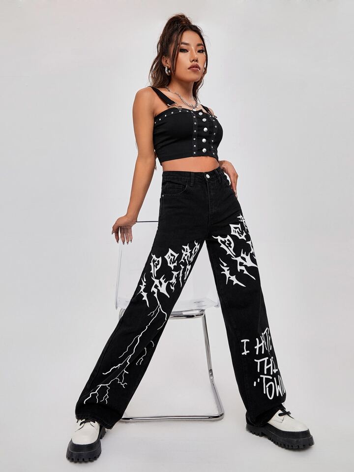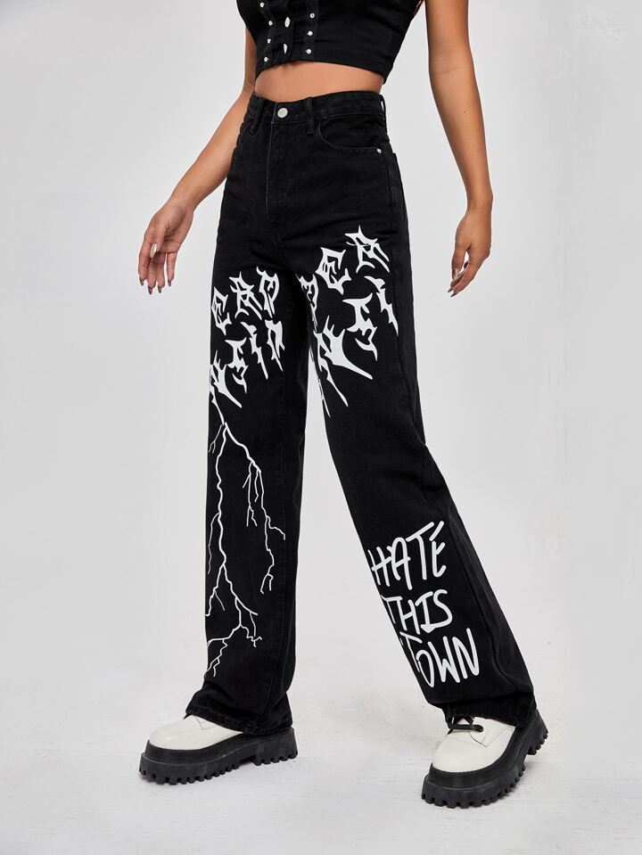 بنطلون جينز مستقيم بطباعة صاعقة و عبارة