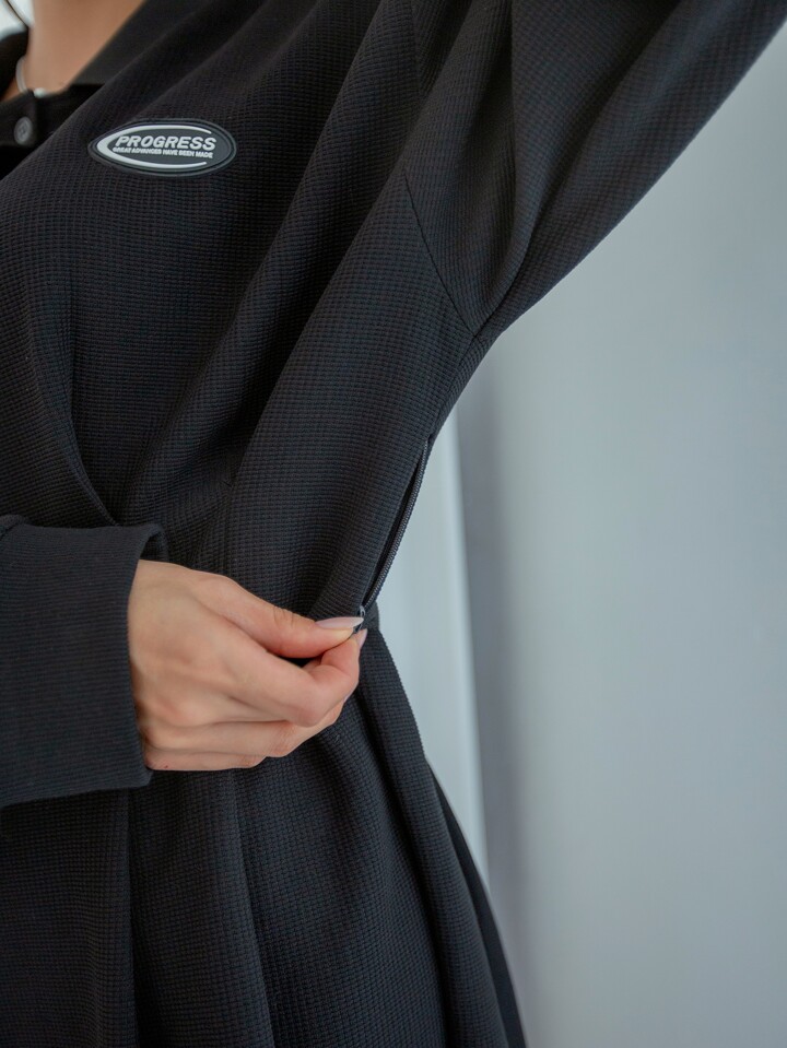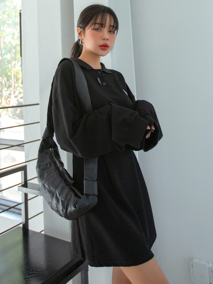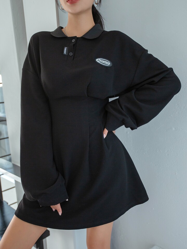 فستان بياقة بولو ذو كتف منخفض مزين بالحرف، فساتين نسائية كاجوال، فستان طويل الأكمام للخريف
