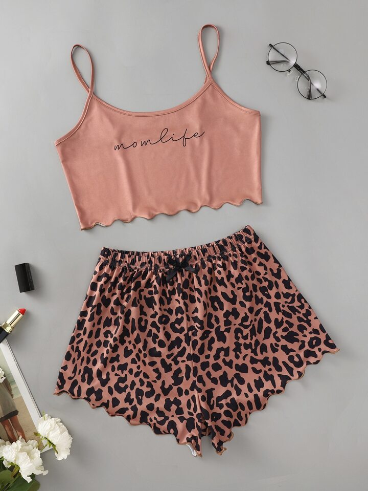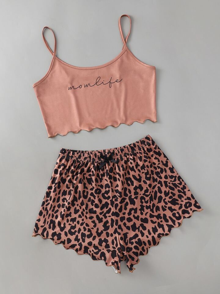 نمط عبارة مقلم نمط نبات الخس صدرية كامي قصير و طباعة الفهد بنطلون قصير طقم بيجامة