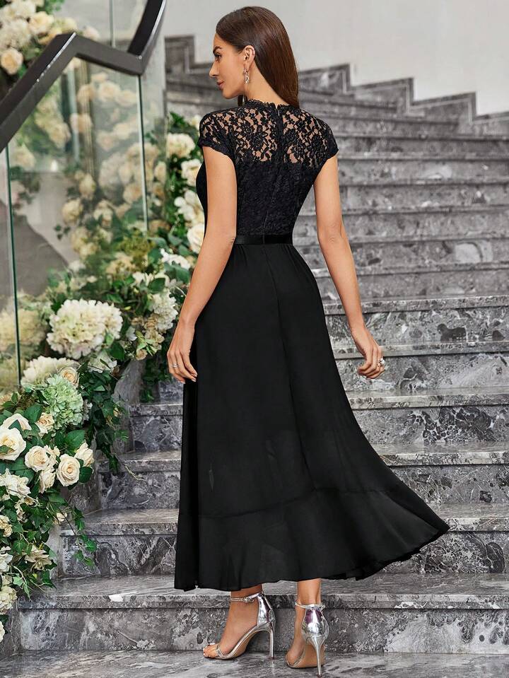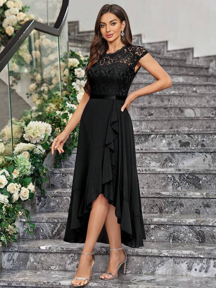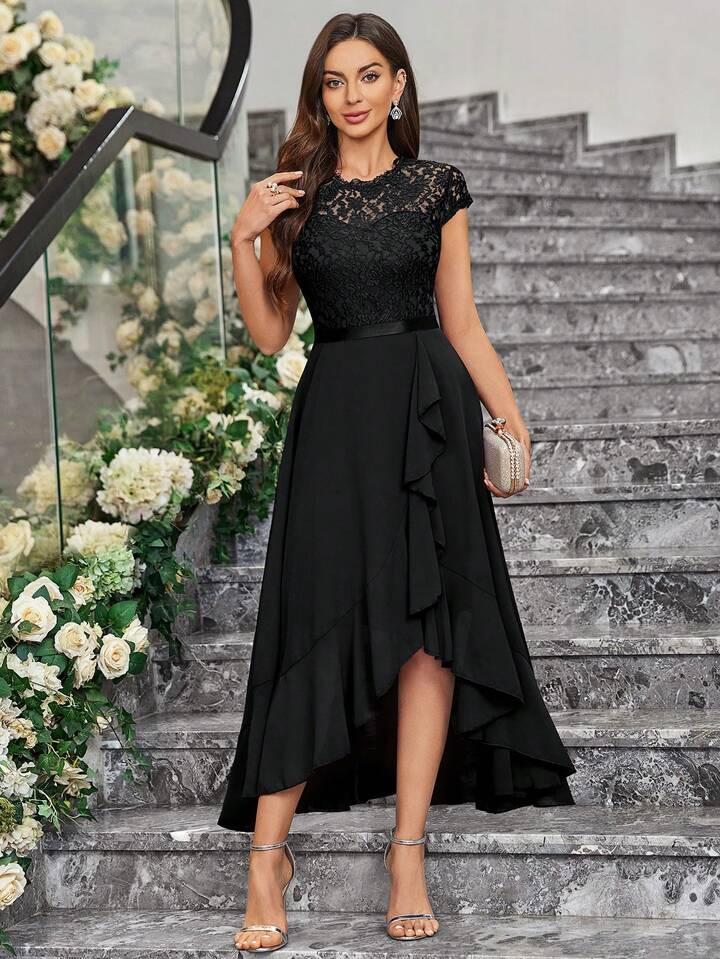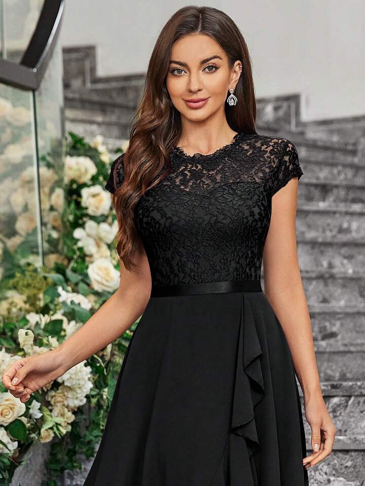 MIUSOL فستان رسمي أنيق من الشبك المطرز بجيوب، له نهاية مُتَوَشّحة للخادمة العروس