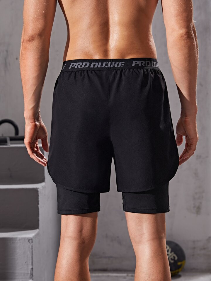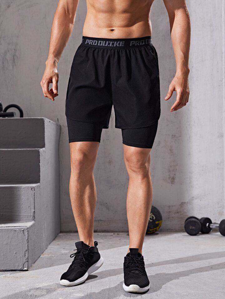 Manfinity Running شورت رياضي مطاطي بجيب الهاتف وشريط مطبوع عليه حرف للرجال بطراز الصديق
