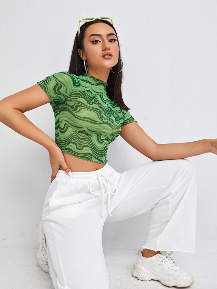 ملابس علوية نسائية زينة على شكل نبات شفاف بشريط متاين بطباعة شاملة كاجوال
