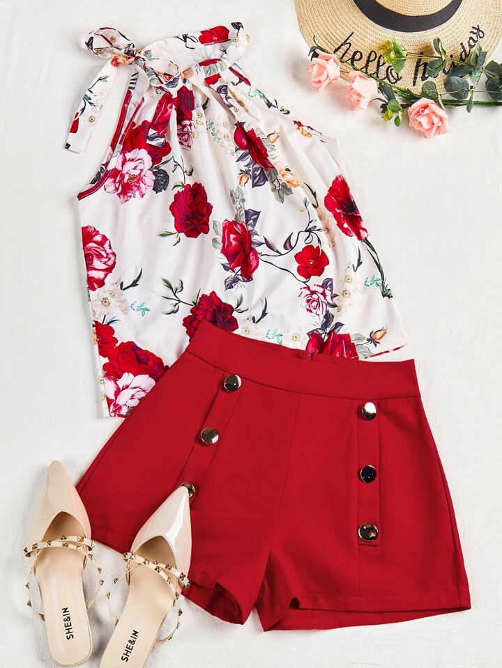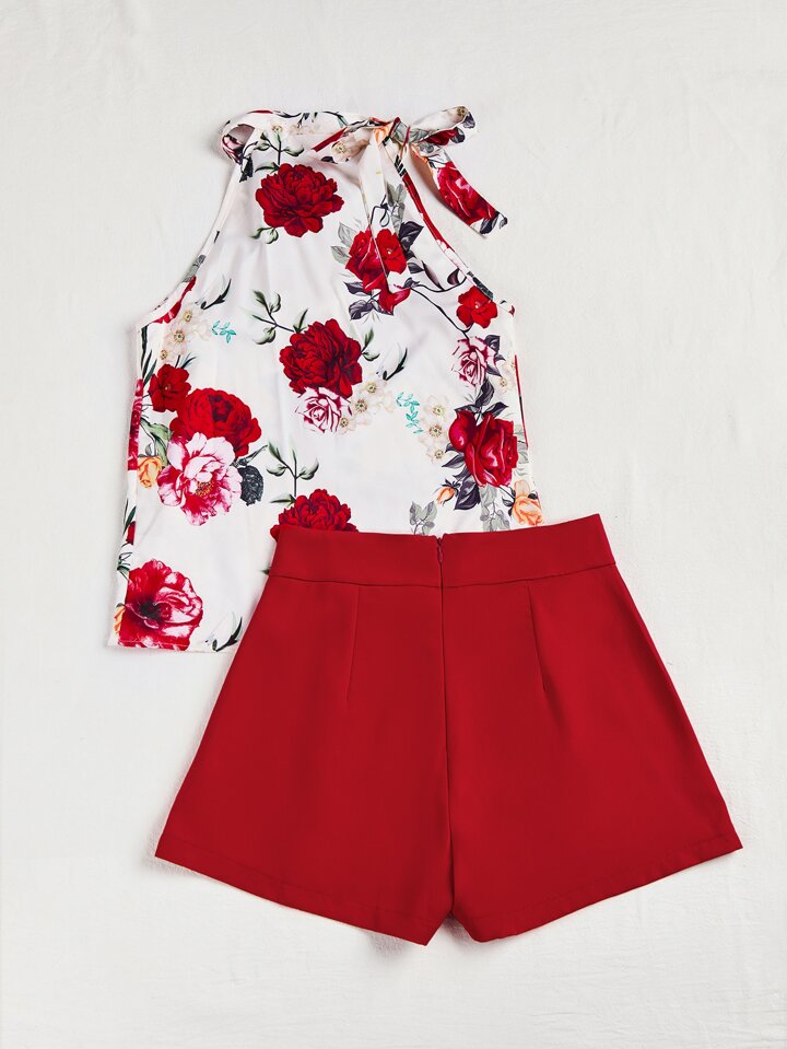 سروال قصير مع لباس علوي معلق معقود ومزهر