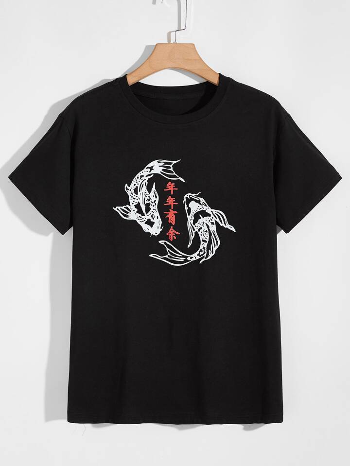 تي شيرت بجرافيك عبارة صيني وسمك للرجال