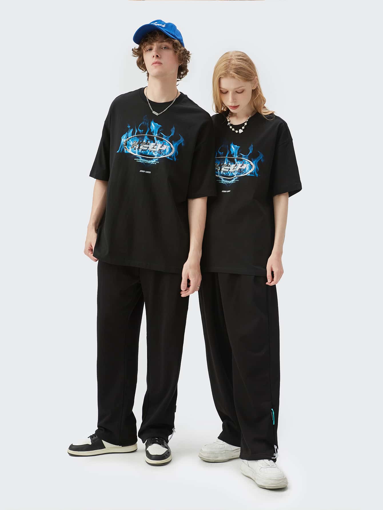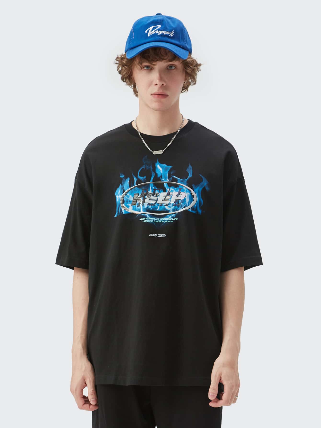 تي شيرت بجرافيك نار وعبارة منخفض الكتف للرجال