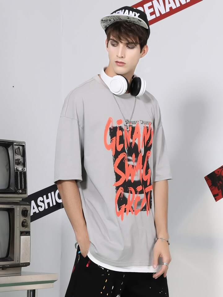 تي شيرت بجرافيك عبارة ومنخفض الكتف للرجال