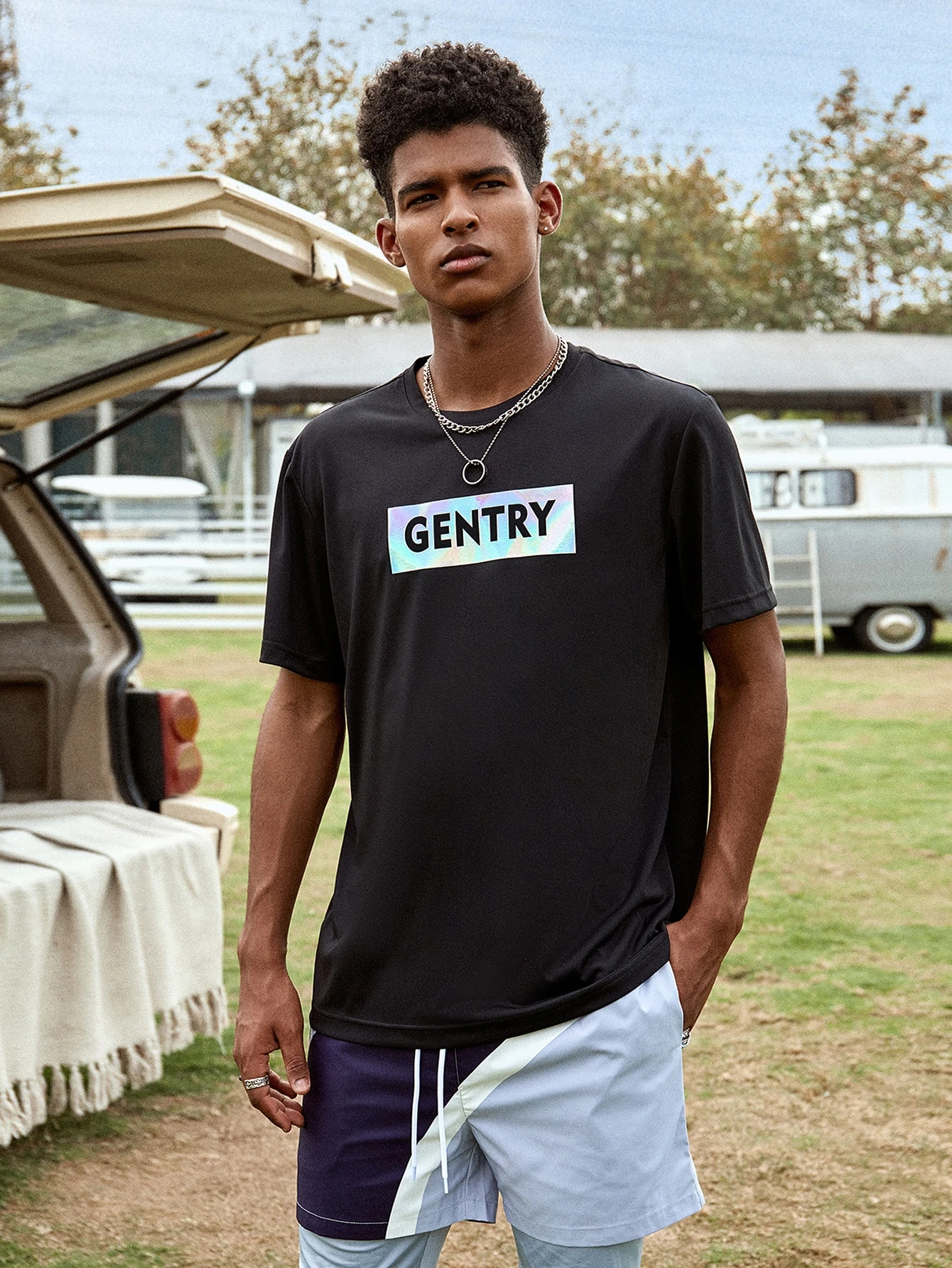 تي شيرت رياضي بجرافيك عبارة هولوغرافيك للرجال