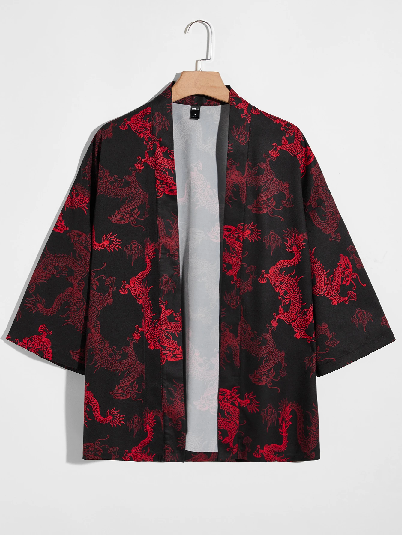 قميص رجالي بطبعات تنين صينية مفتوح من الأمام وأكمام قصيرة بالألوان الجرافيكية
