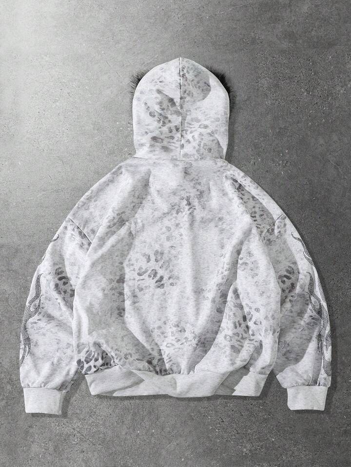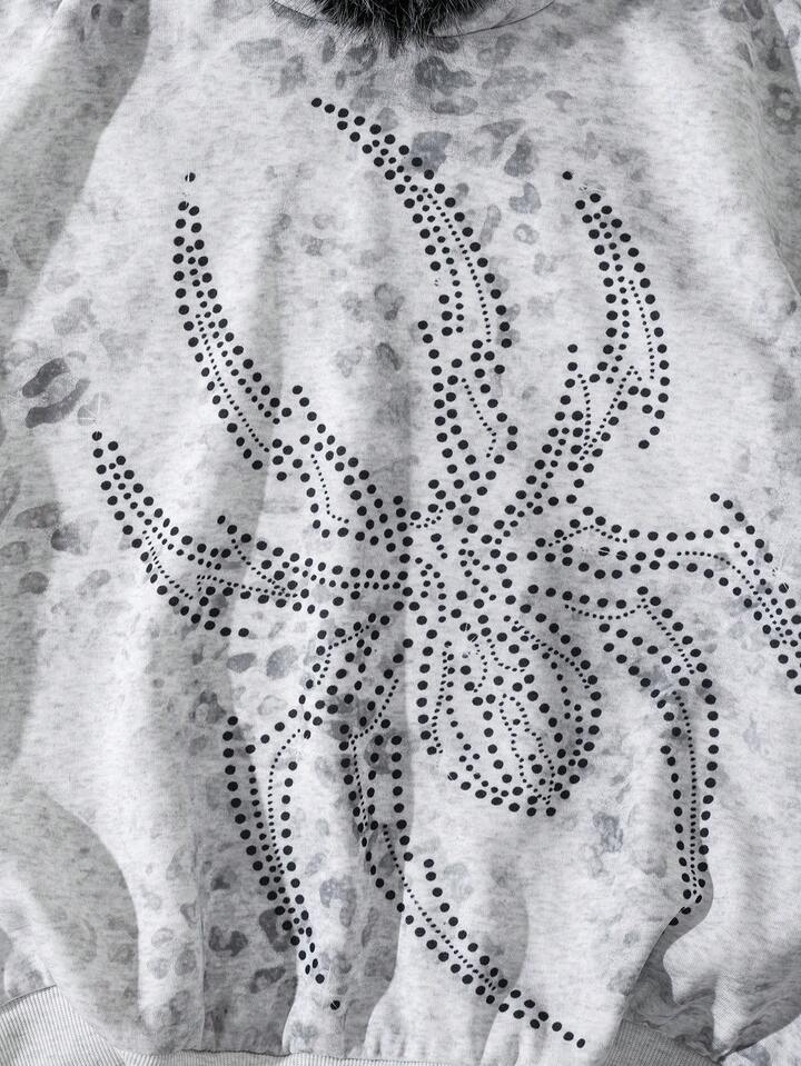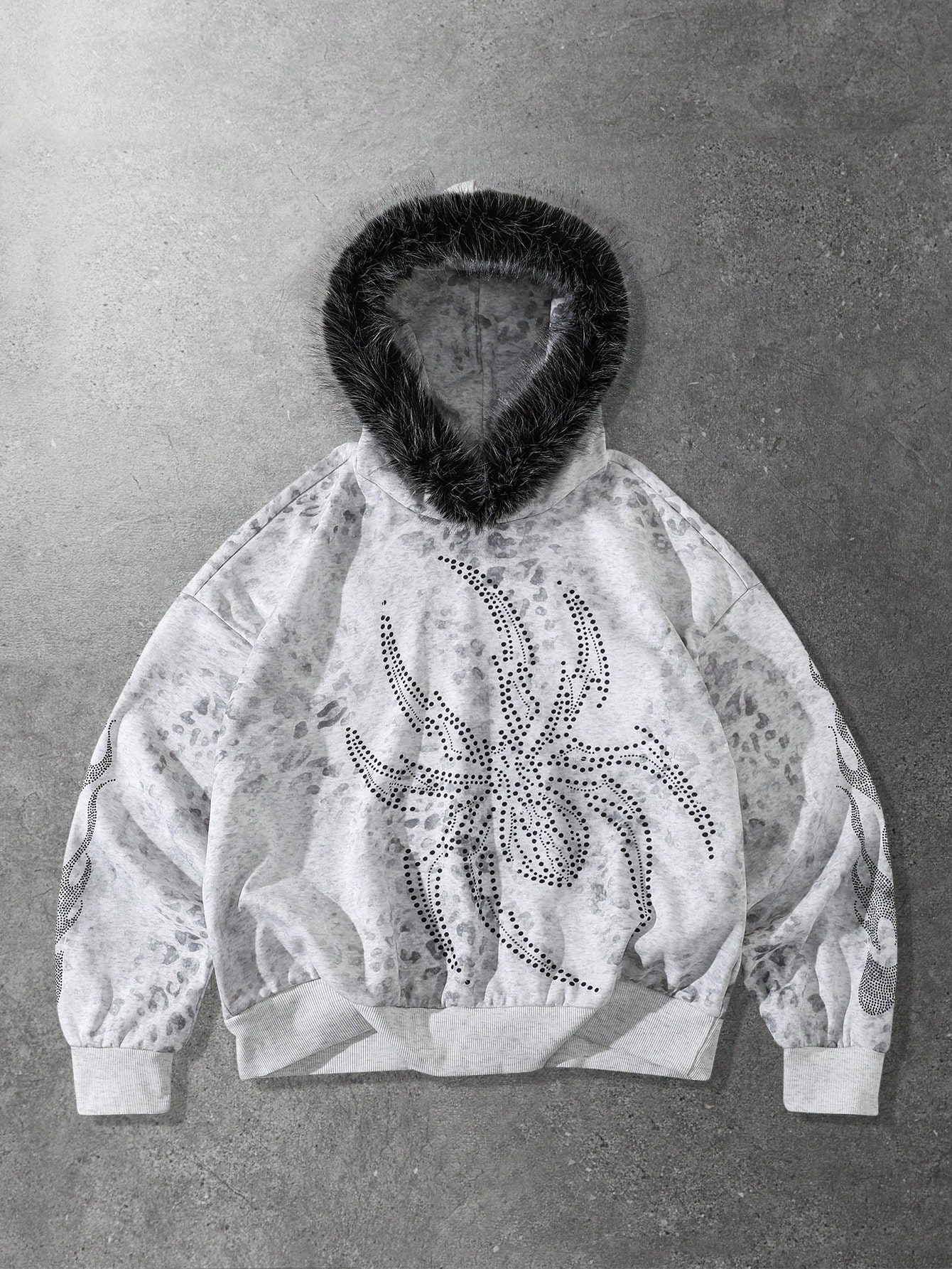 بلوزة رجالية مطبوعة بعنكبوت مرصعة بالراين مع طوق من الفرو وأكمام طويلة